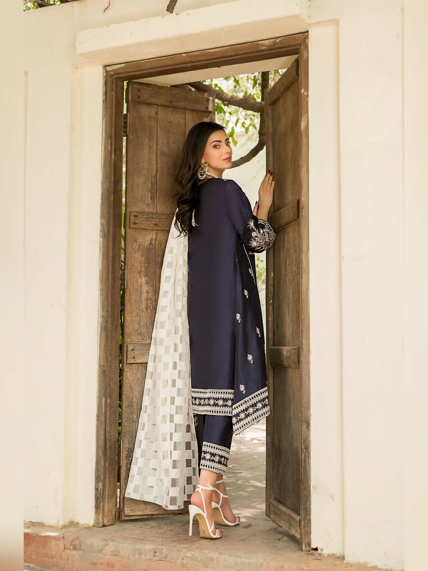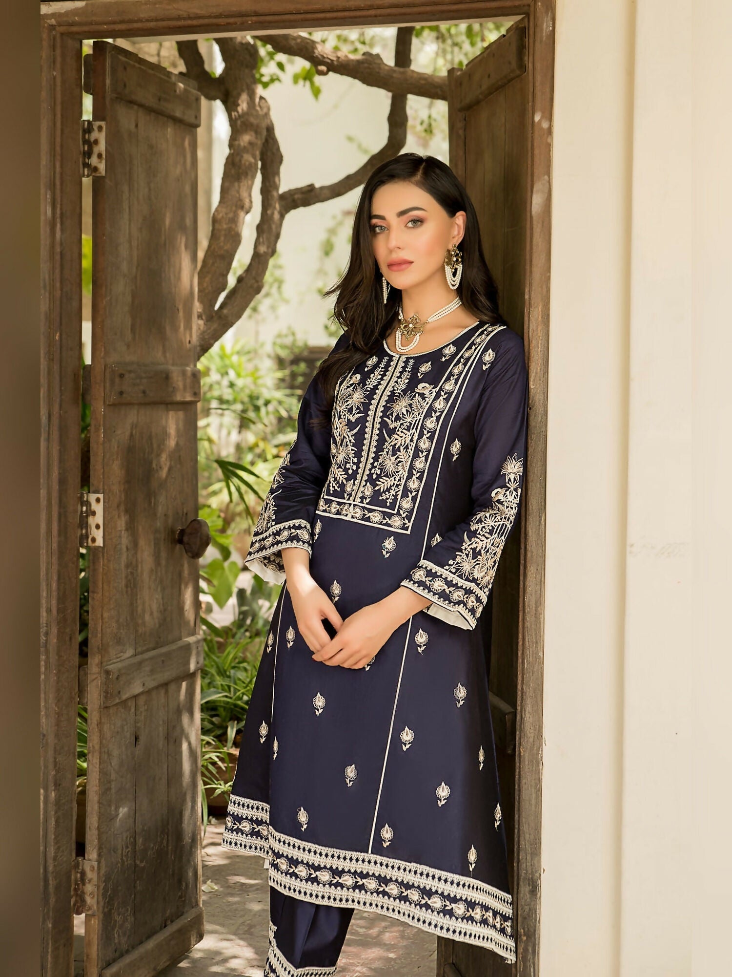 This elegant navy blue outfit is crafted from soft Chambray Cotton and features a fully em...