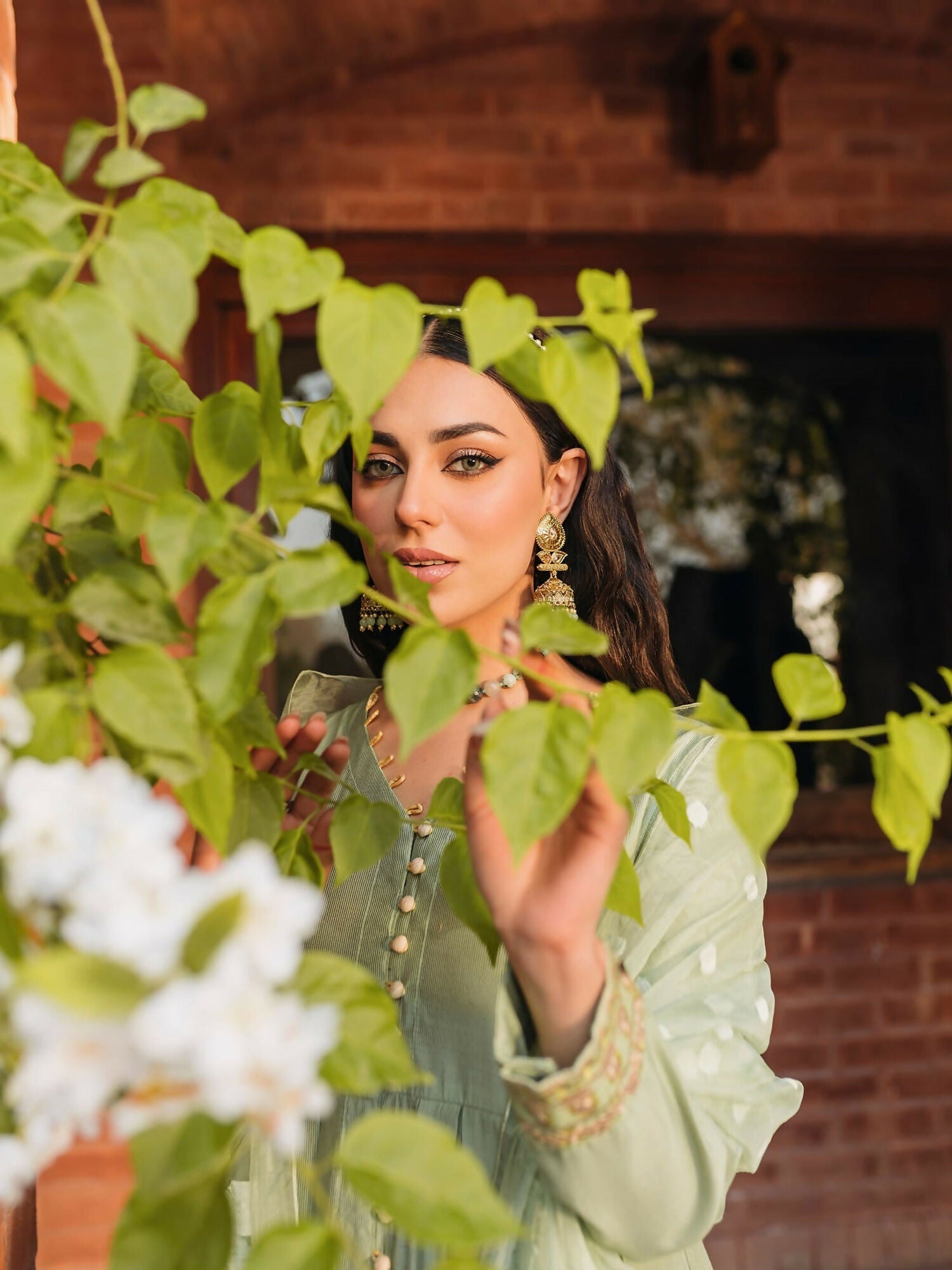 This mint green stitched outfit features an embroidered Chambray Katan gown with button detailing, paired with a matching trouser and a pure organza dupatta for a soft, elegant finish.