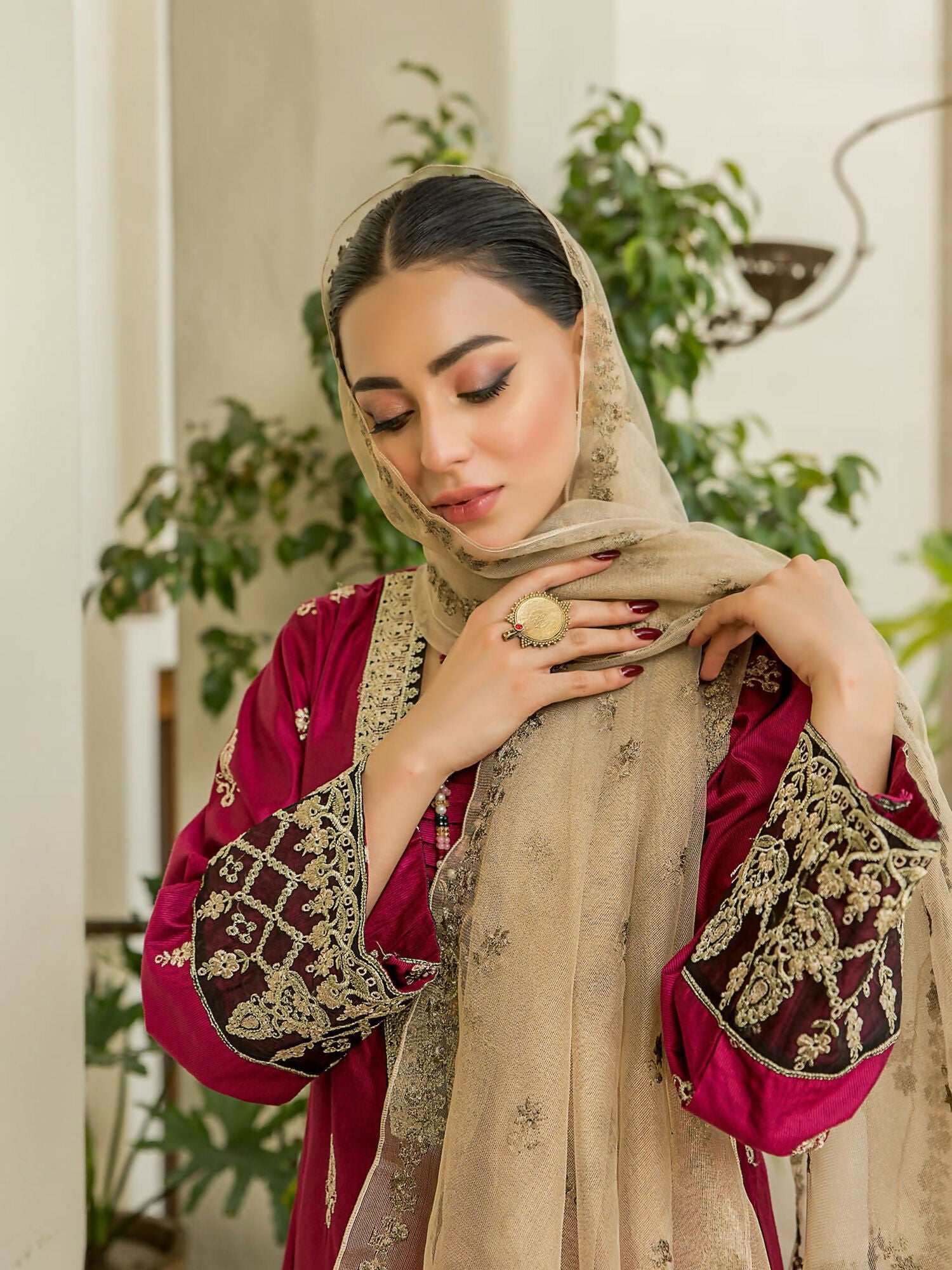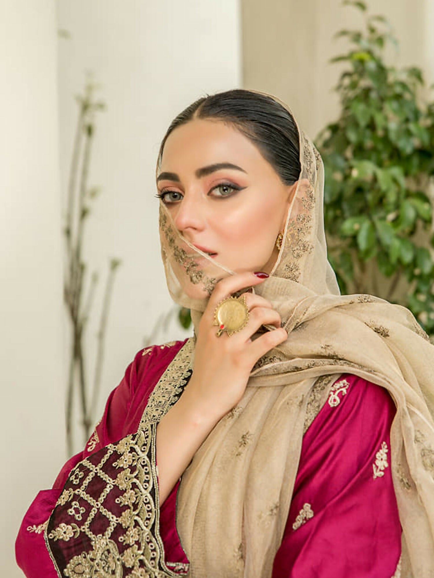 This beautiful Fuchsia Pink outfit features rich embroidery on premium Chambray Katan fabric, paired with an elegant embroidered net dupatta for a complete festive look.