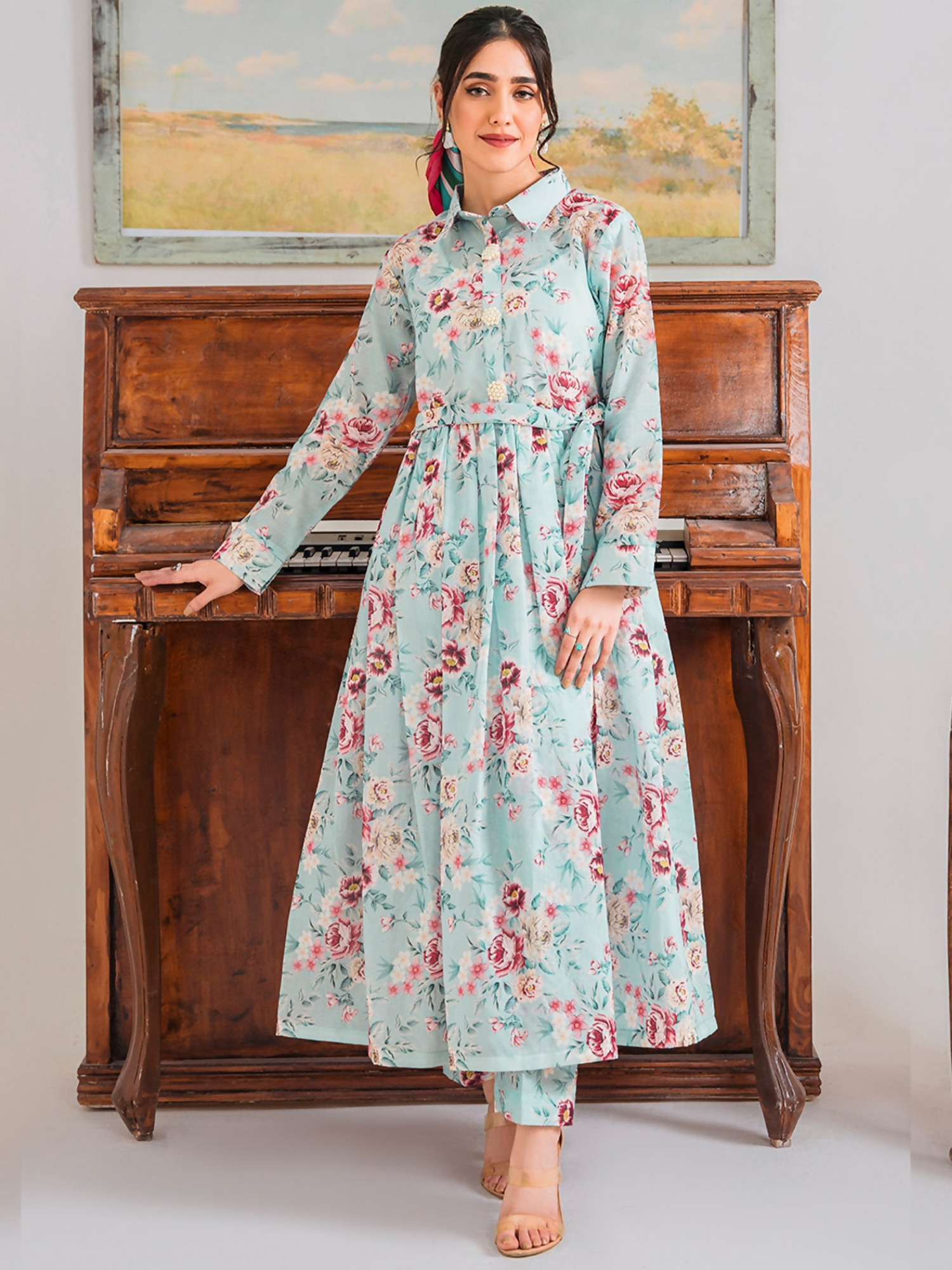 This beautiful sea blue stitched outfit is crafted from digital printed Cambray Katan and styled with button embellishment for a neat, elegant look. It comes with a matching trouser, making it a perfect everyday 2-piece set.