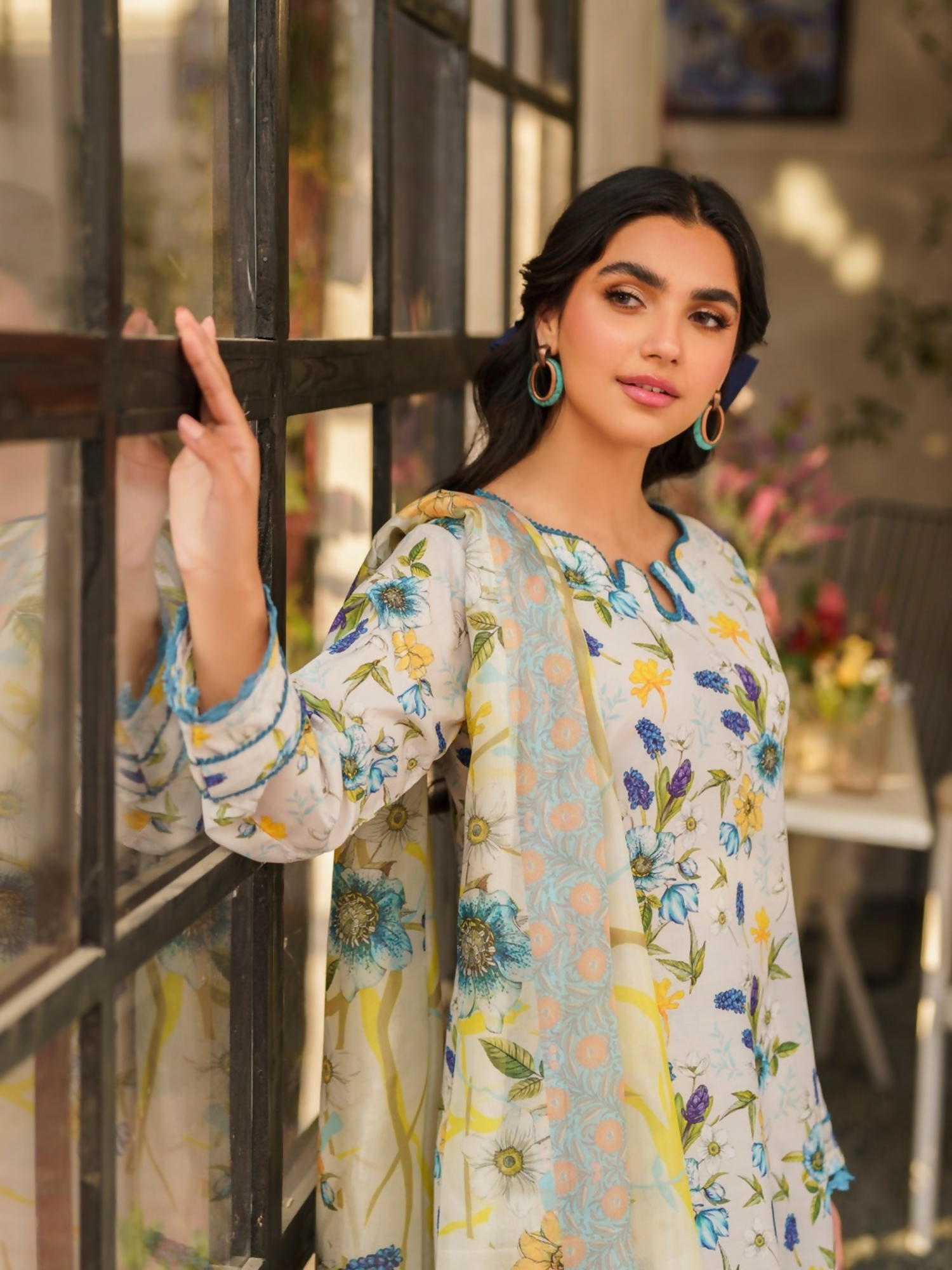 This milky white digital printed co-ord set features delicate lace embellishment and comes with a matching digital printed silk dupatta, giving it a chic and elegant look.