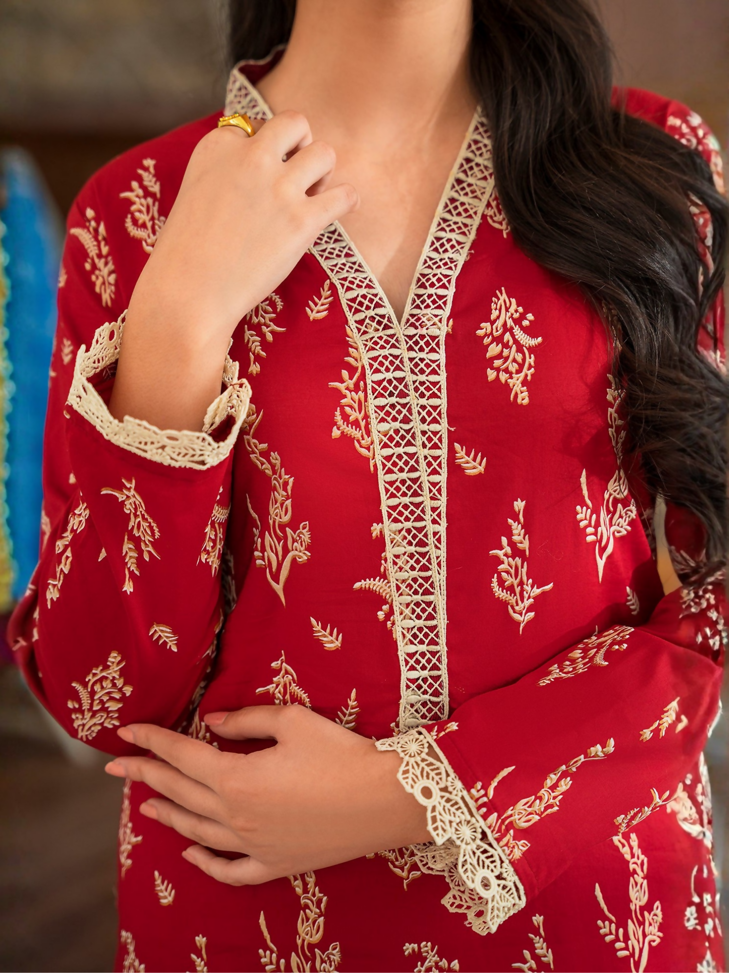 A stylish reddish maroon cotton lawn 2-piece set featuring an embossed screen-printed design with delicate lace embellishments, paired with a matching trouser for an elegant everyday look.