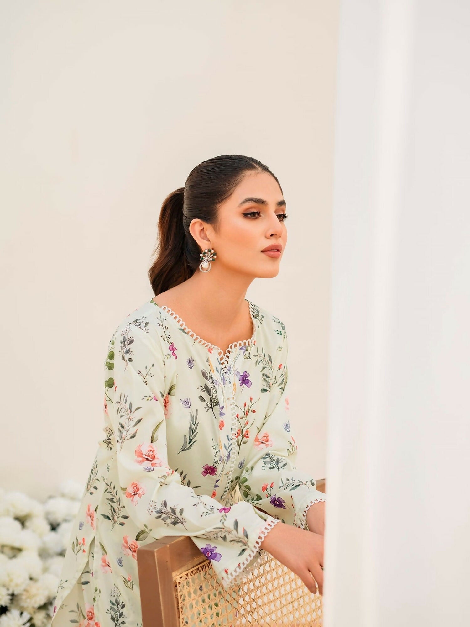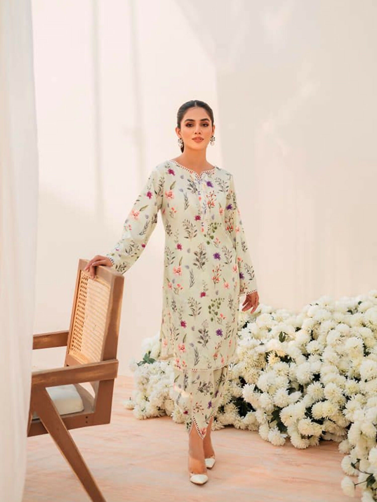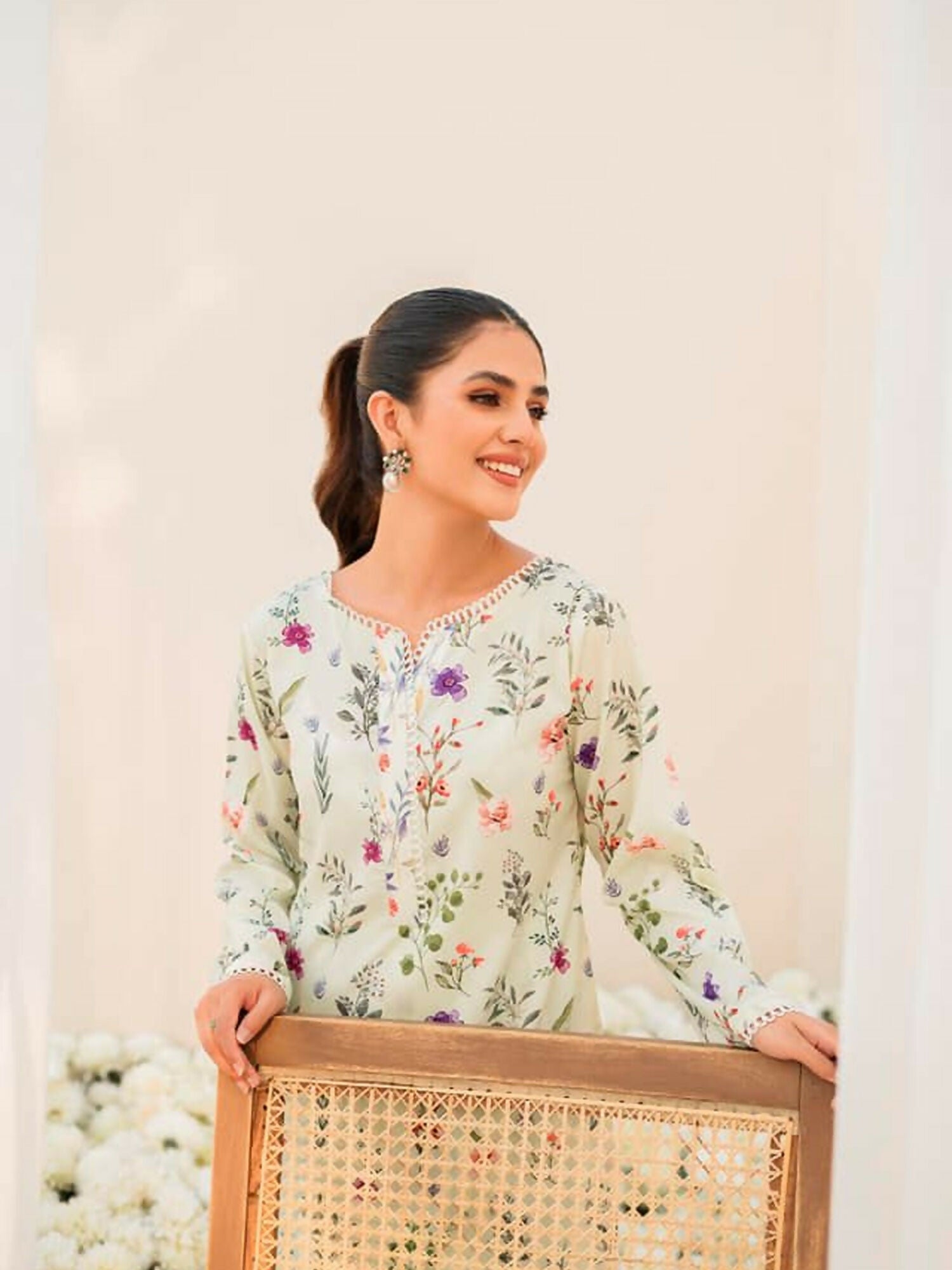 A beautifully stitched ready-to-wear outfit crafted in high-quality grip fabric, featuring a soft lime-green base with elegant digital floral printing. Designed for effortless style and everyday comfort.
