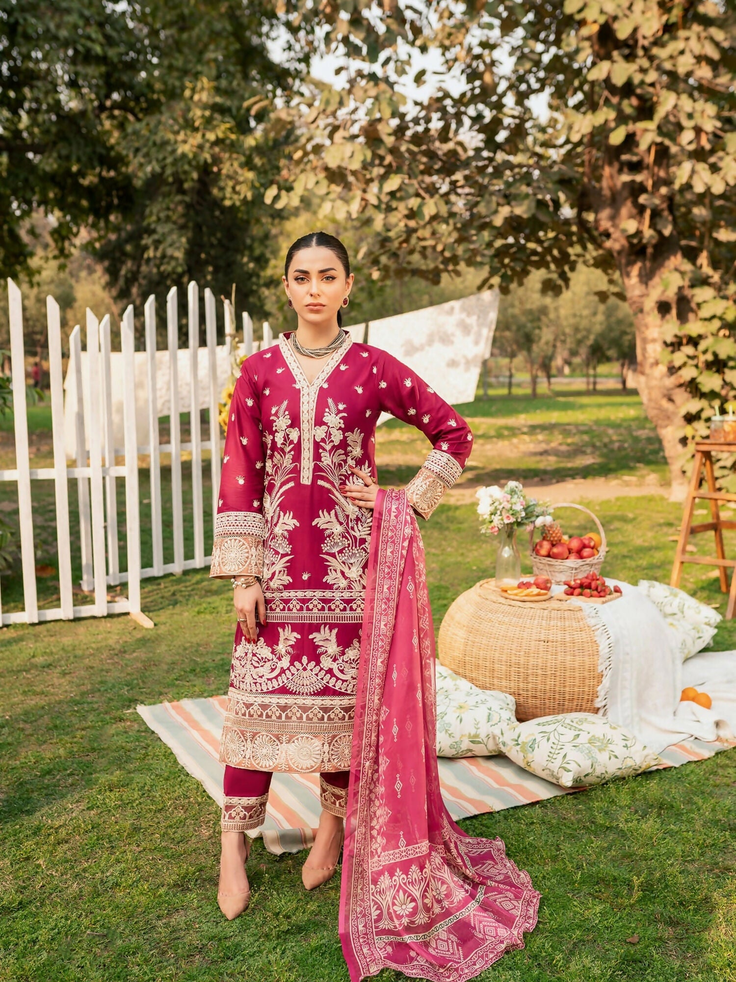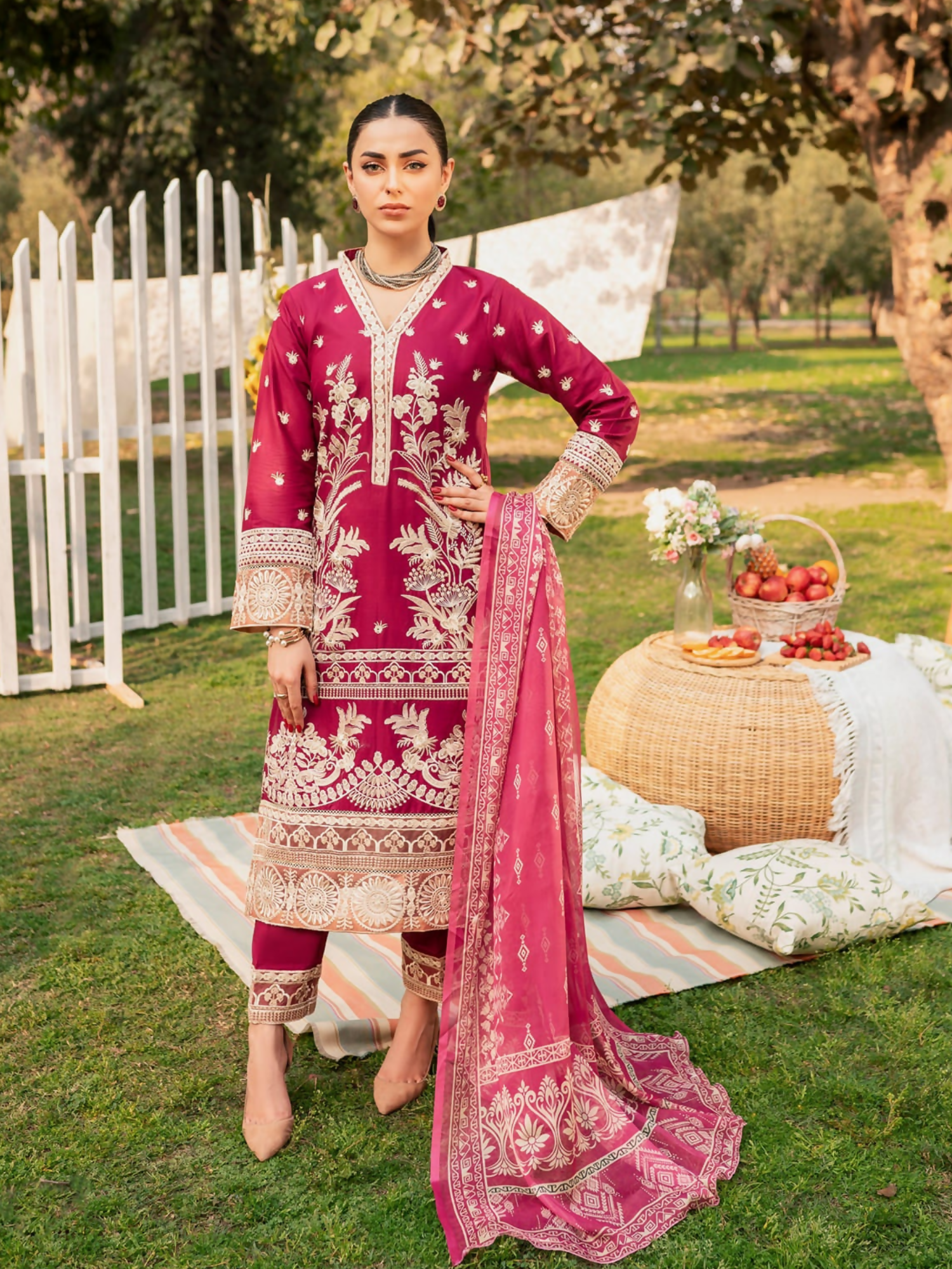 This beautiful magenta stitched outfit features a fully embroidered lawn shirt paired with an embroidered cotton trouser. The digital printed silk dupatta adds a soft, classy touch to complete the look.