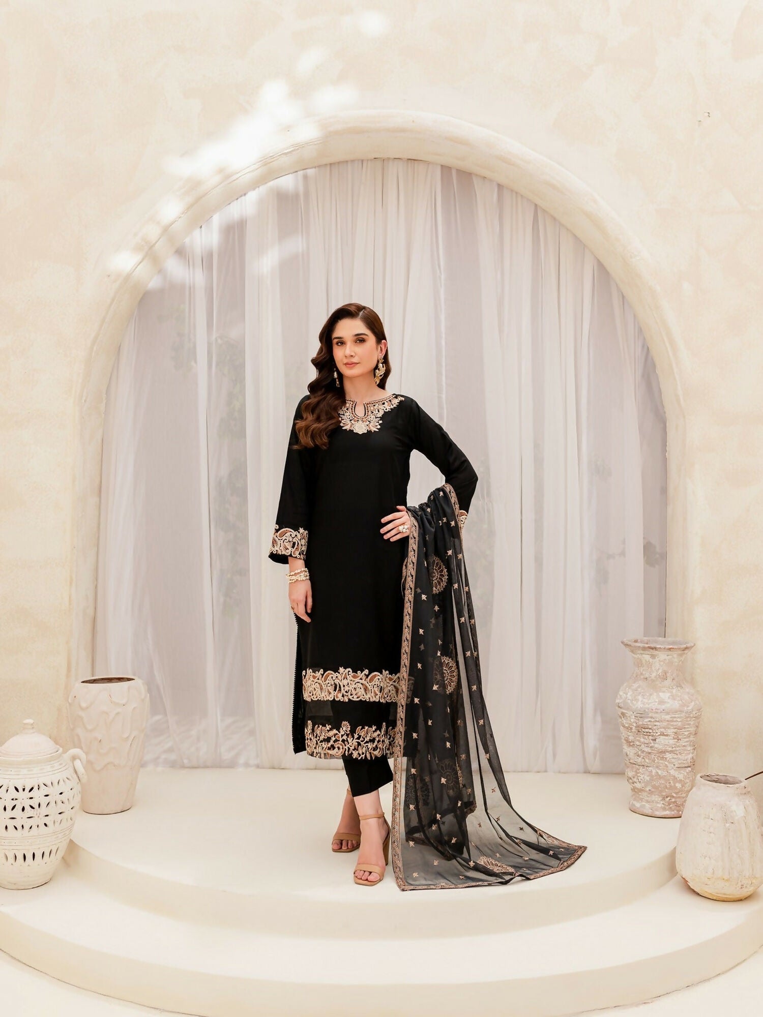 This elegant black stitched outfit features a fully embroidered lawn shirt paired with a matching cotton trouser. The embroidered cotton net dupatta adds a refined and stylish finish.