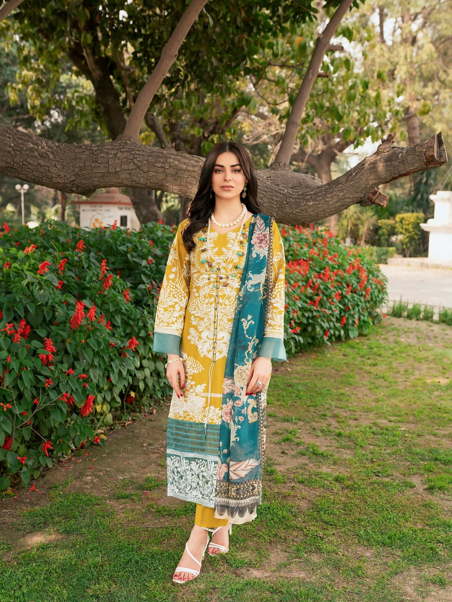 This mustard stitched outfit features a fully embroidered lawn shirt with organza laces, paired with a cotton trouser. A digital printed silk dupatta completes the look with a refined touch.