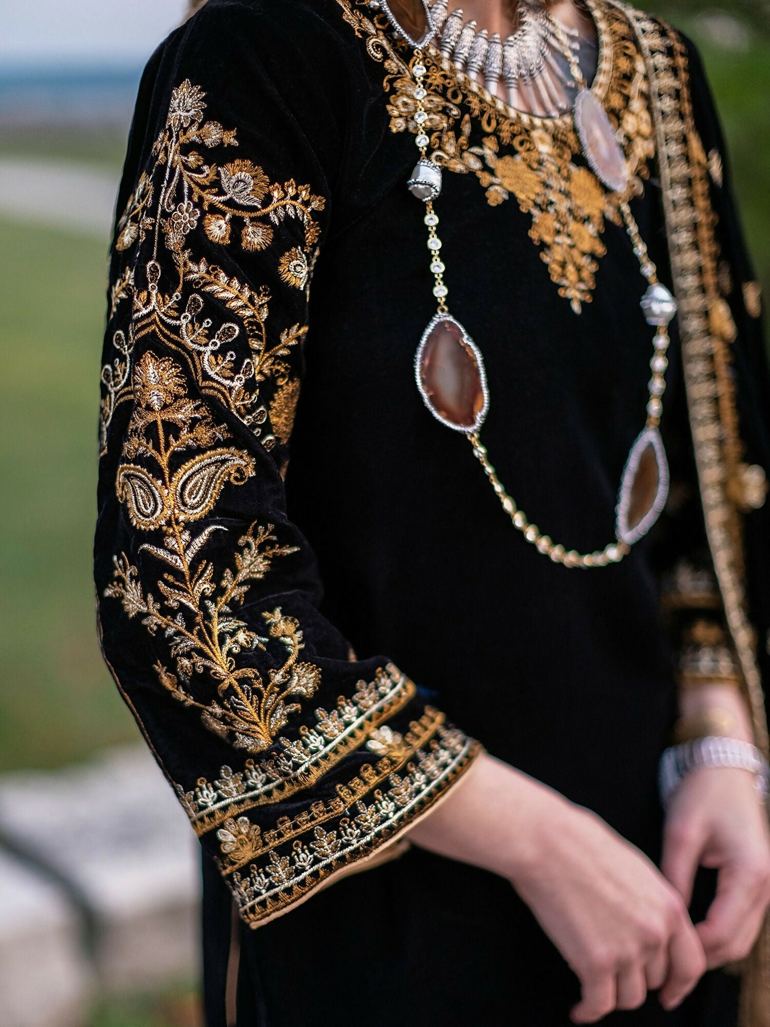 A luxurious black micro-velvet ensemble featuring rich embroidery on the shirt, culottes, ...