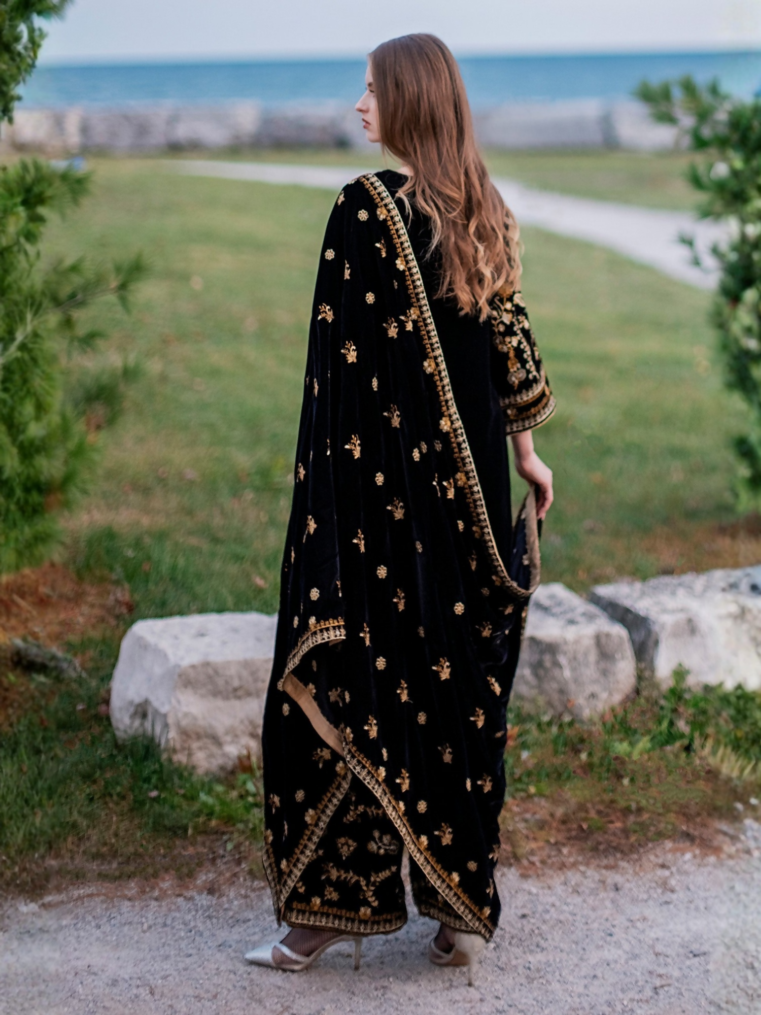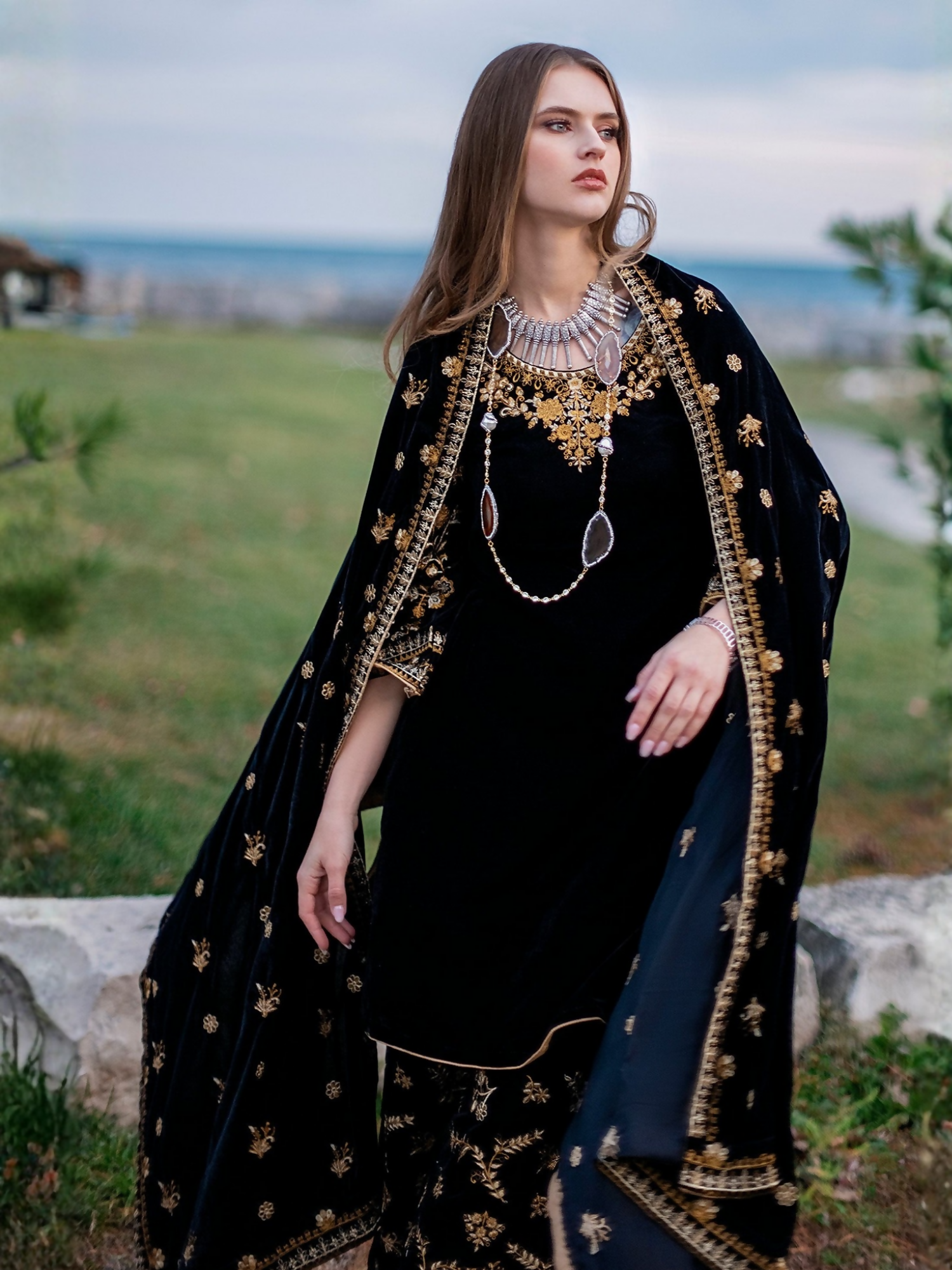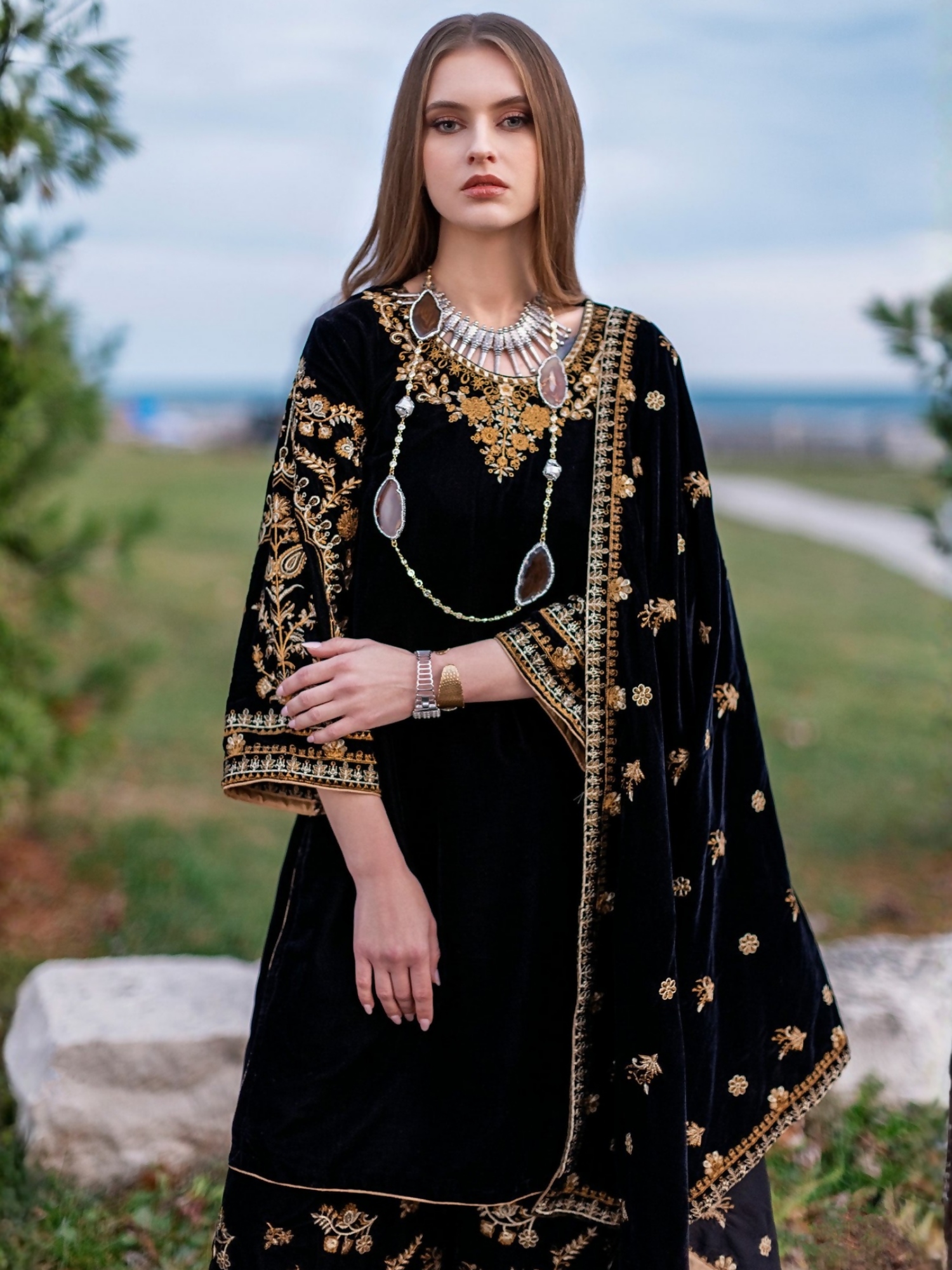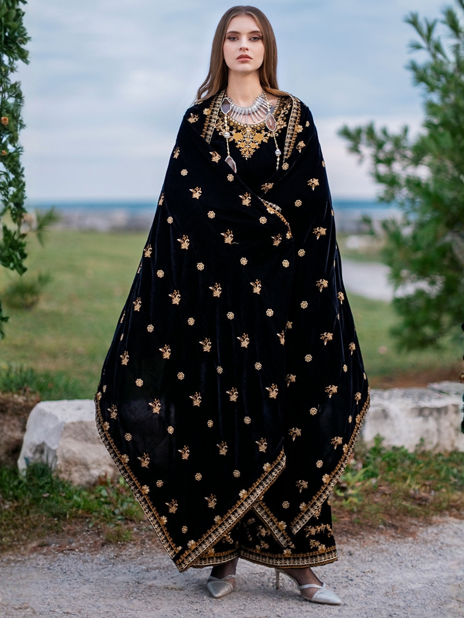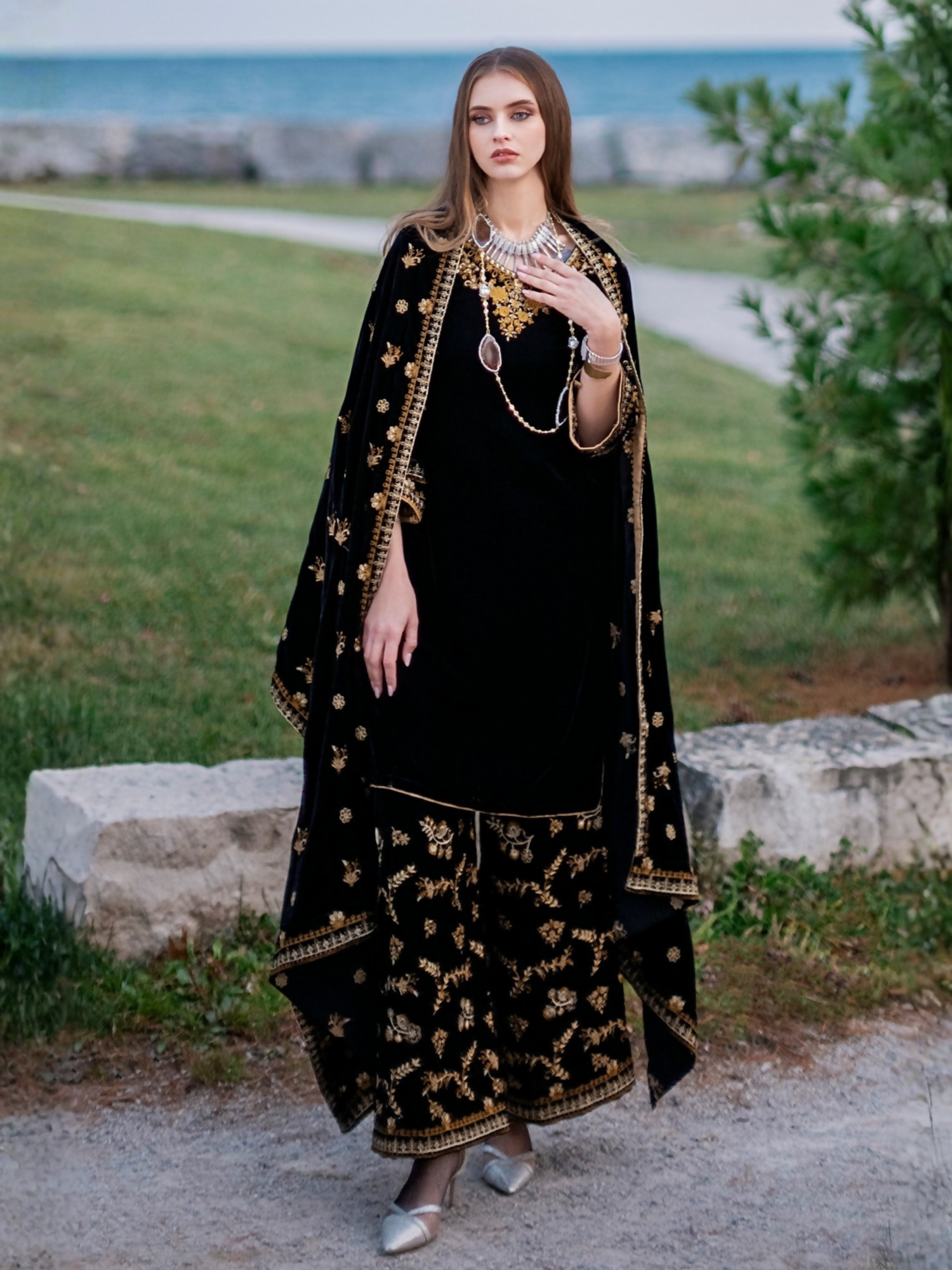 A luxurious black micro-velvet ensemble featuring rich embroidery on the shirt, culottes, and shawl for an elegant and premium winter look.