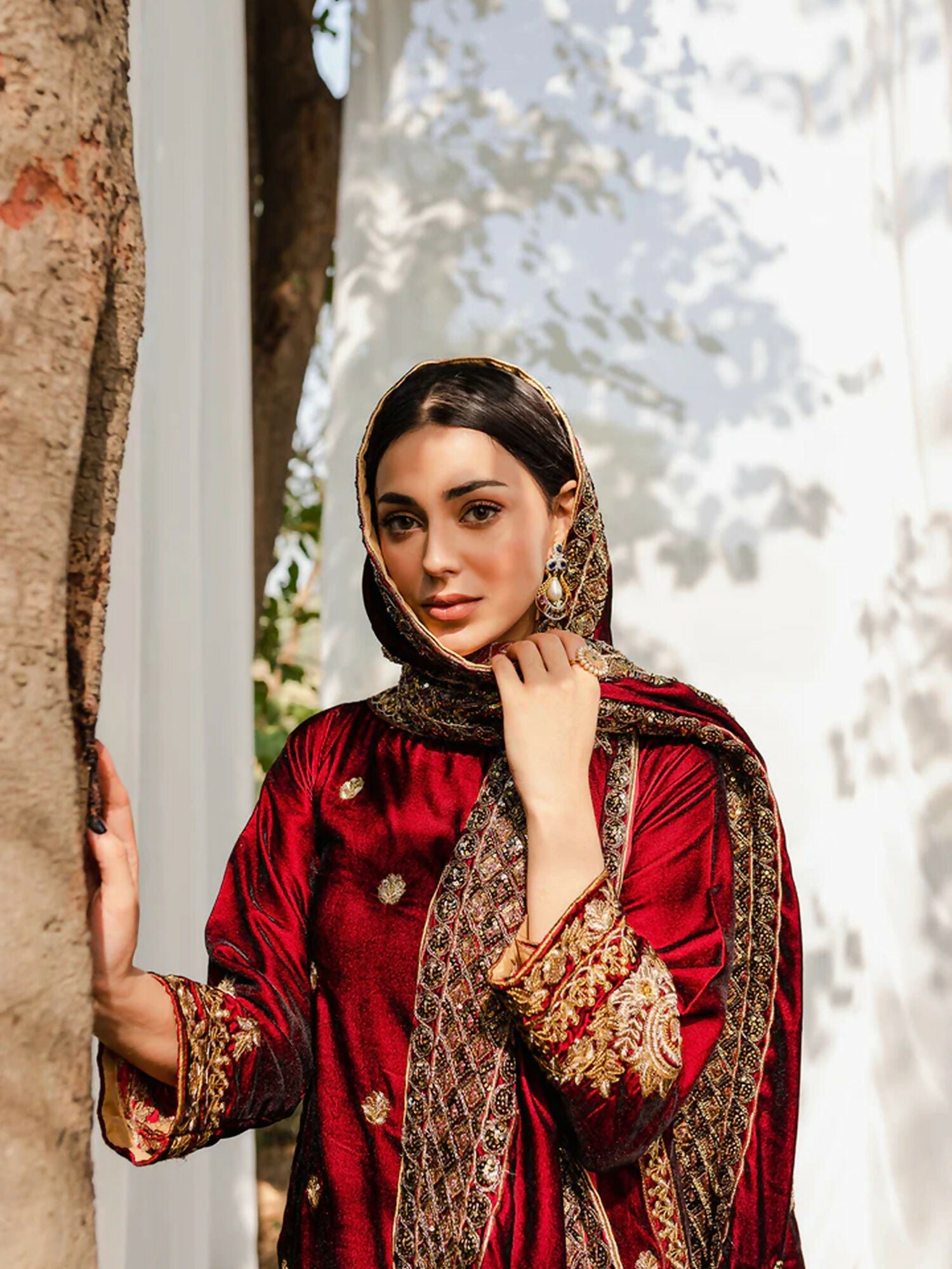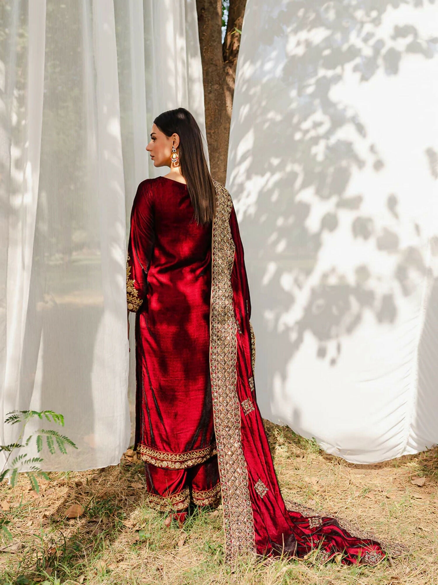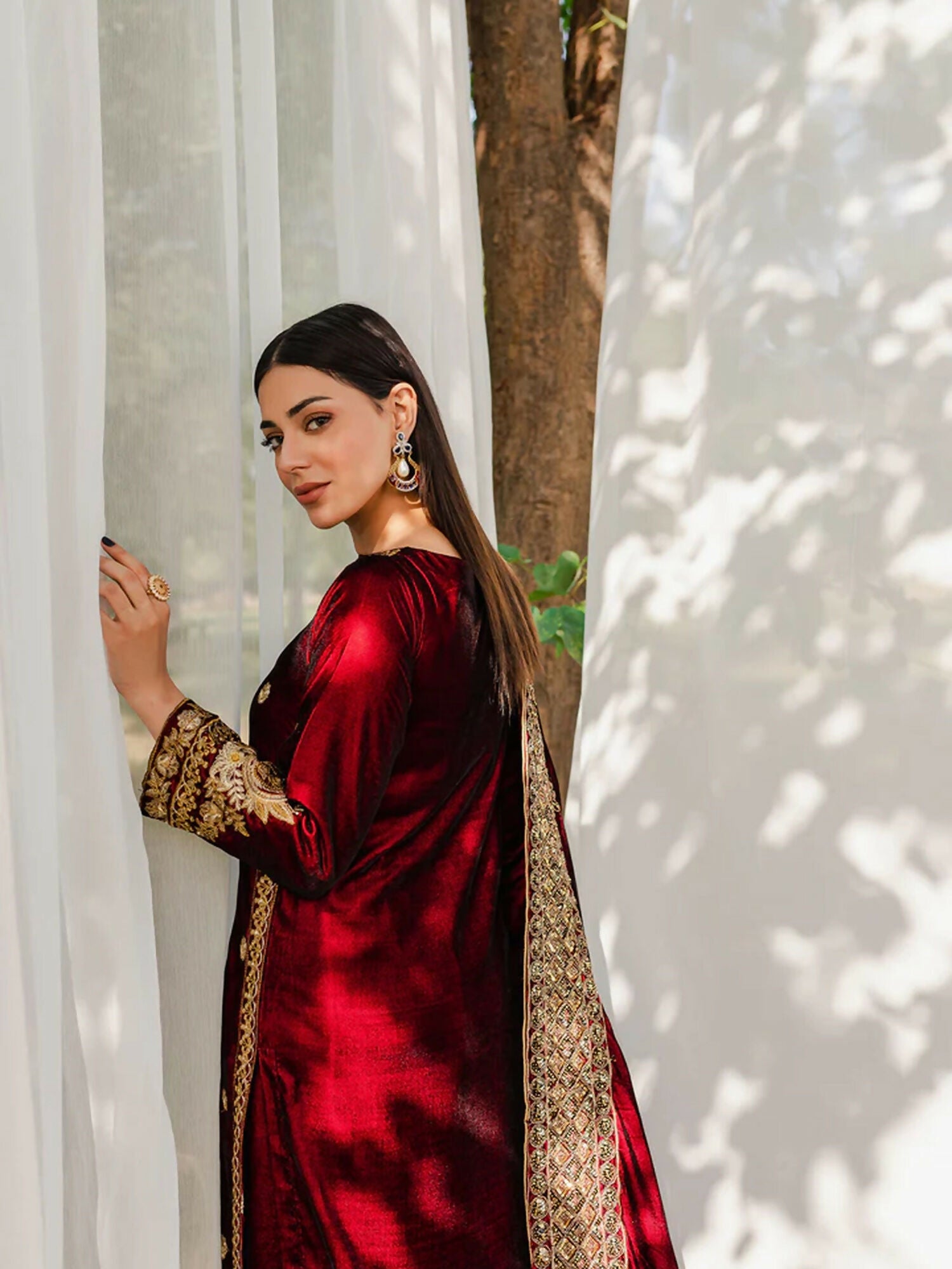 A luxurious double-tone maroon velvet outfit crafted from premium Micro Velvet 9000, adorned with intricate tilla embroidery. Paired with a matching embroidered culotte and a richly embellished velvet shawl, this ensemble is perfect for refined festive or formal occasions.