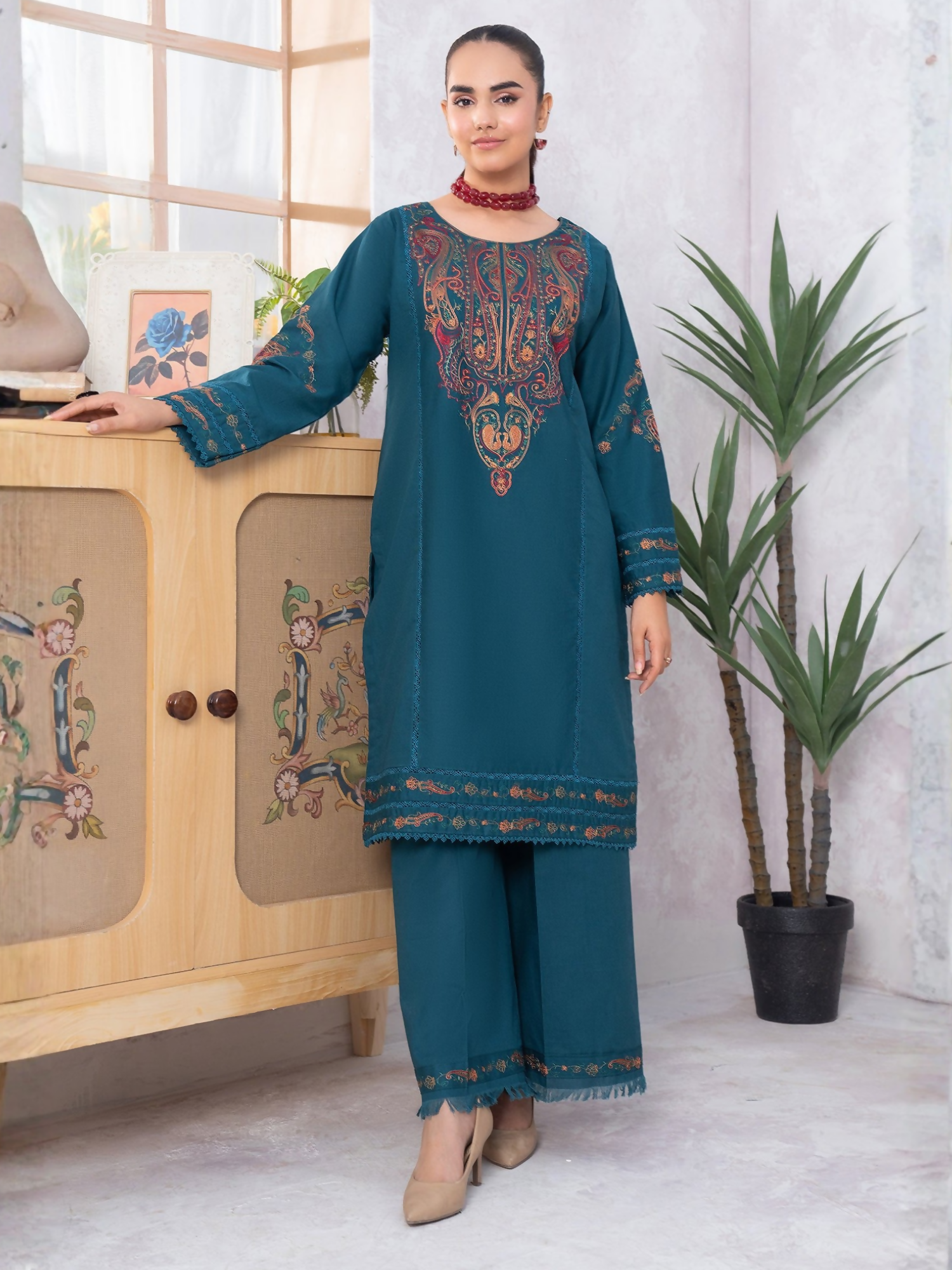 Shirt: Embroidered Khaddar shirt in a rich Teal shade, designed with fine detailing for a warm and elegant winter look.