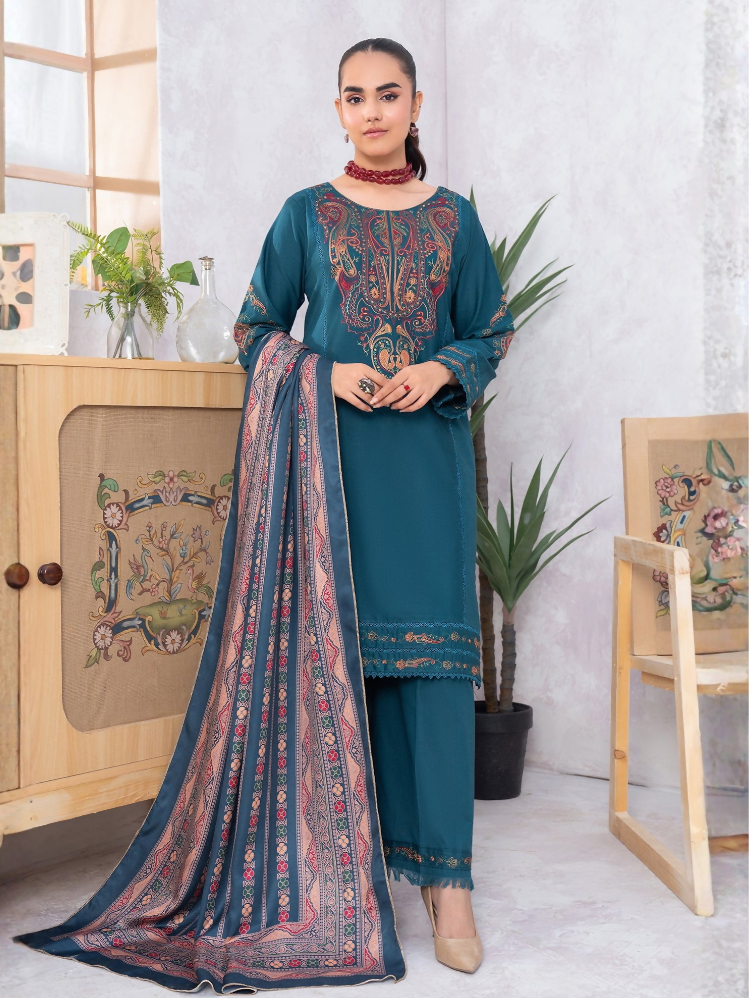 A stylish winter 3-piece ensemble featuring an embroidered Khaddar shirt, a matching embroidered trouser, and a vibrant digital printed shawl—perfect for cozy and elegant seasonal wear.