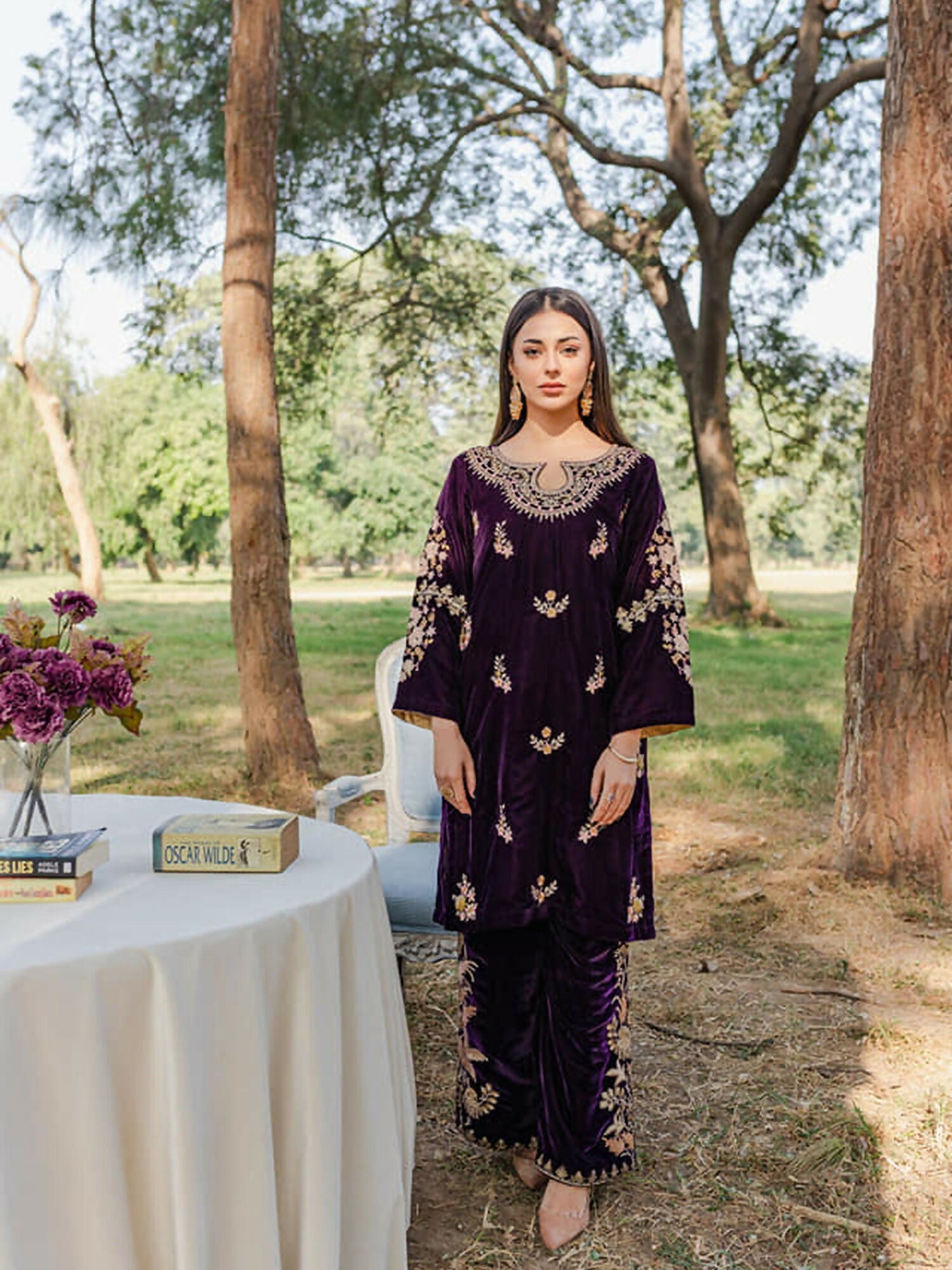 A luxurious plum ensemble crafted on premium Micro Velvet 9000, featuring rich tilla embroidery for an elegant festive look. The matching velvet trousers complete the outfit with a refined, coordinated finish.