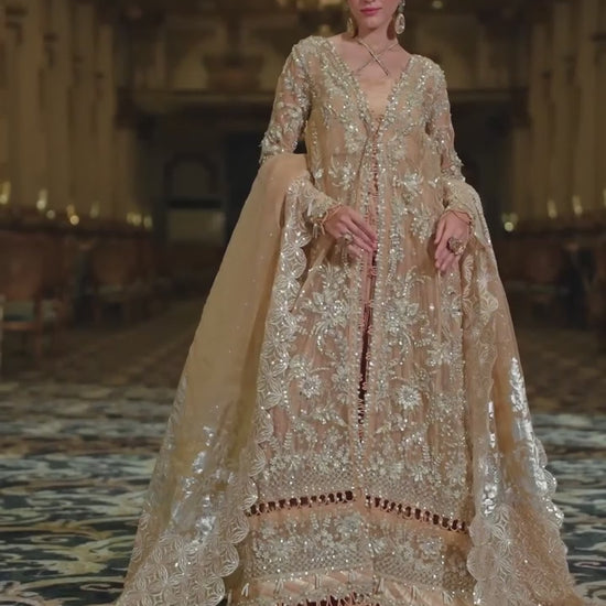 A luxurious handworked ensemble designed with meticulous detailing and premium fabrics. The outfit features heavily embroidered panels, delicate lacework, and a beautifully finished dupatta paired with a raw silk sharara for an elegant formal look. Perfect for festive and wedding occasions, this dress reflects timeless sophistication.