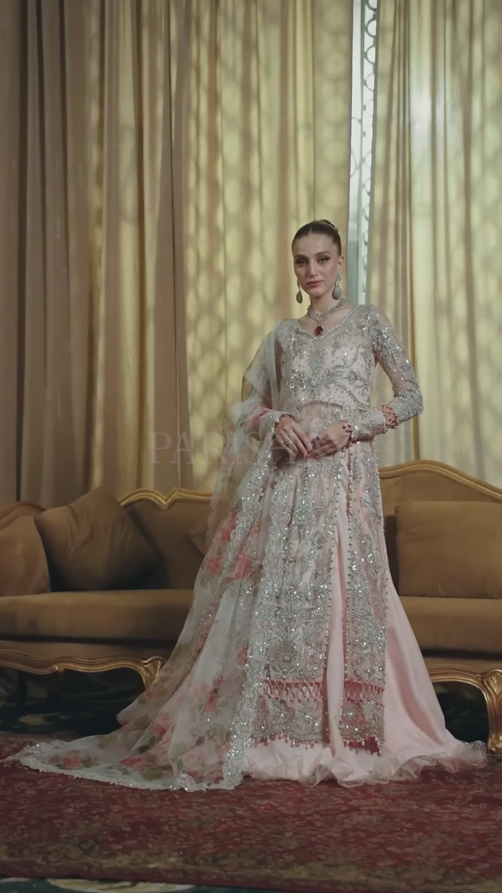 An elegant unstitched bridal outfit beautifully crafted with handwork embroidery and premium raw silk. The detailed panels, fine sleeve work, and ornate borders bring a regal charm to this ensemble. Paired with a printed organza dupatta and raw silk lehenga, it is an ideal choice for wedding and festive occasions.