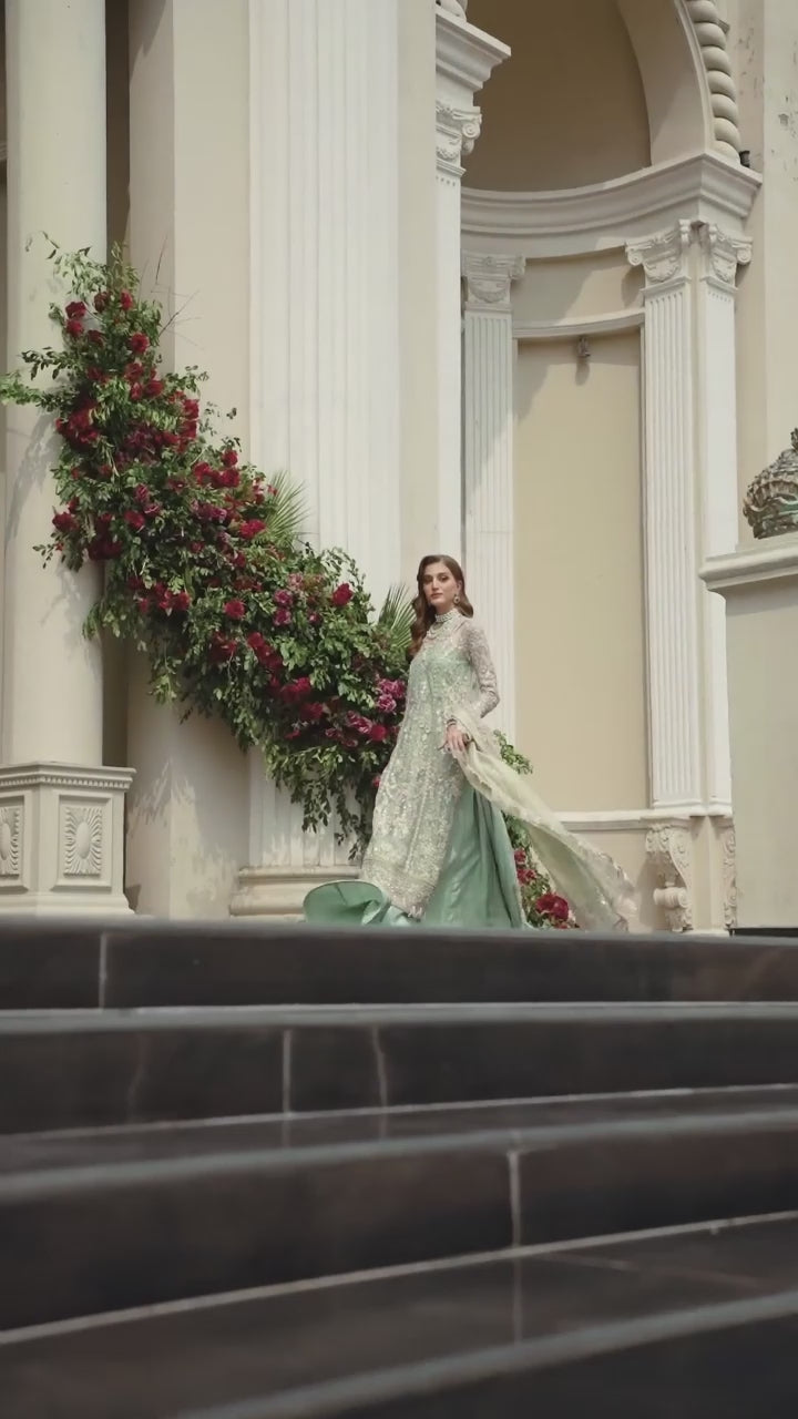 This exquisite unstitched bridal ensemble is crafted with intricate handwork embroidery and premium fabrics. The richly embroidered panels, detailed sleeves, and embellished borders bring a timeless elegance. Paired with a luxurious Bamber Masoori dupatta and raw silk lehenga, it is a statement outfit for weddings and grand festivities.
