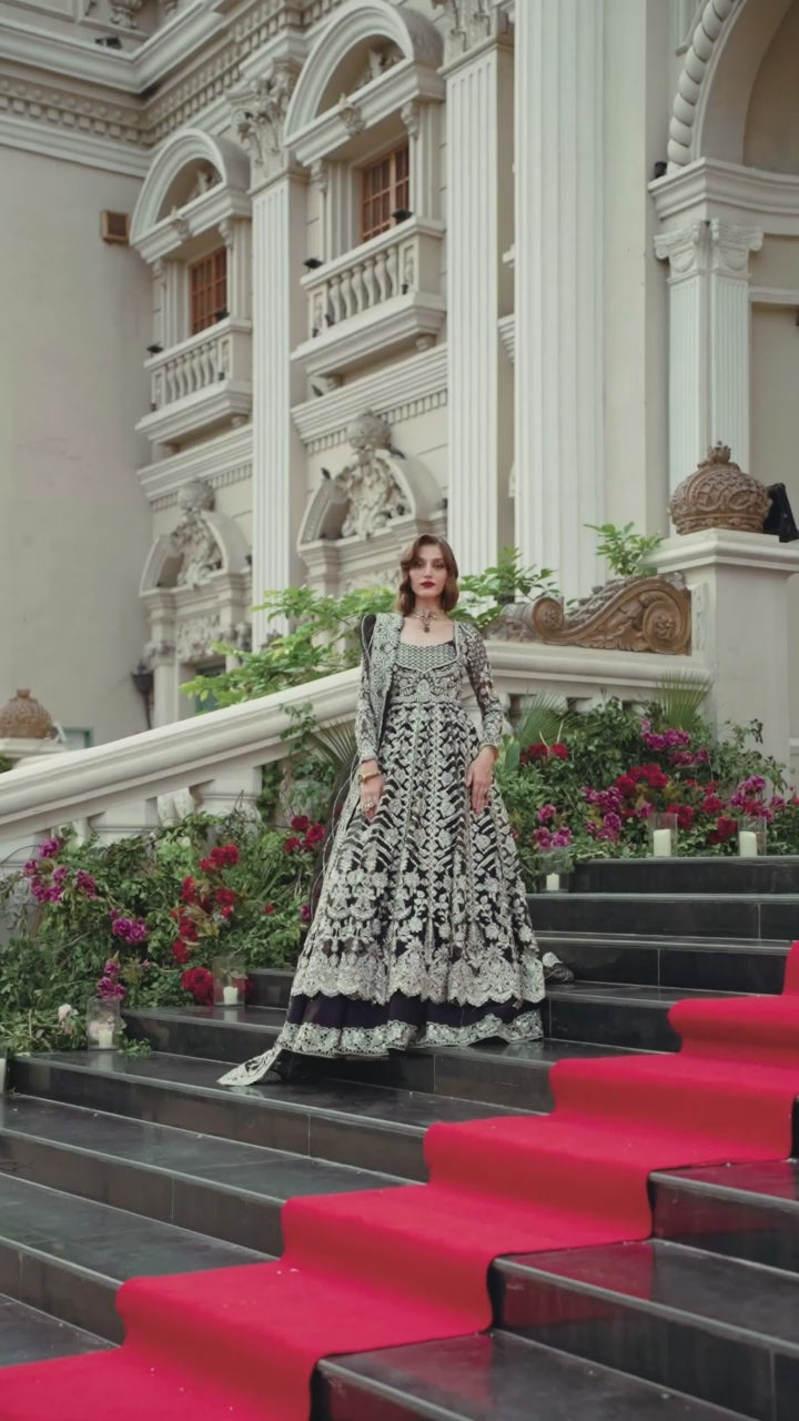 An exquisite unstitched bridal ensemble adorned with delicate handwork and rich embroidery. Designed with multiple kali panels, statement borders, and a finely detailed dupatta, this outfit embodies elegance and grandeur. Paired with a raw silk lehenga and inner, it makes the perfect choice for wedding and formal occasions.