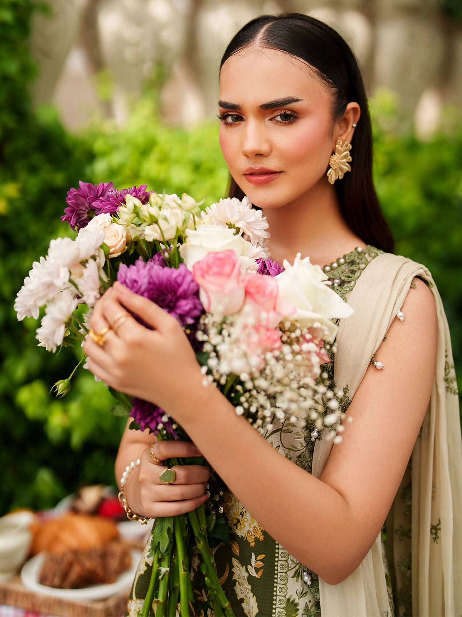 A stylish 3-piece viscose suit featuring a printed shirt with elegant embroidery, paired with a matching printed trouser and an embroidered chiffon dupatta for a refined and graceful look.
