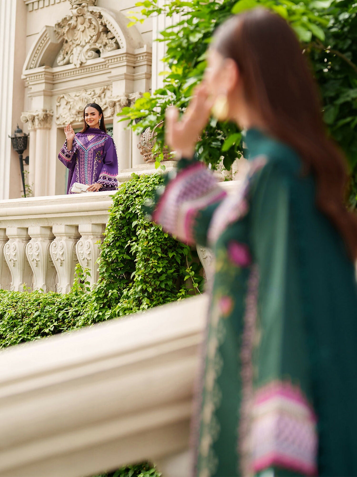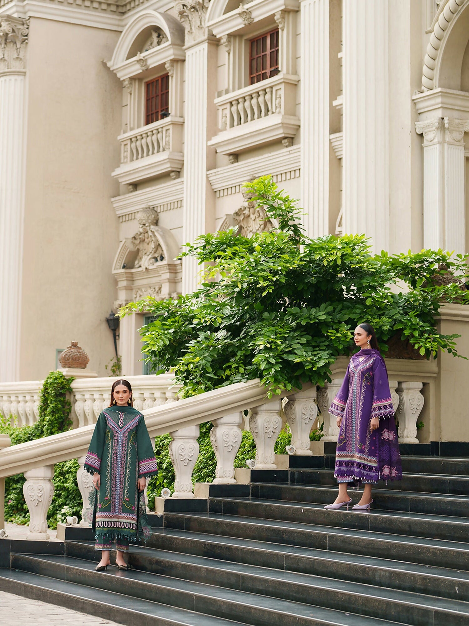 A stylish 3-piece viscose suit featuring a printed shirt with elegant embroidery, paired with a matching printed trouser and an embroidered chiffon dupatta for a refined and graceful look.