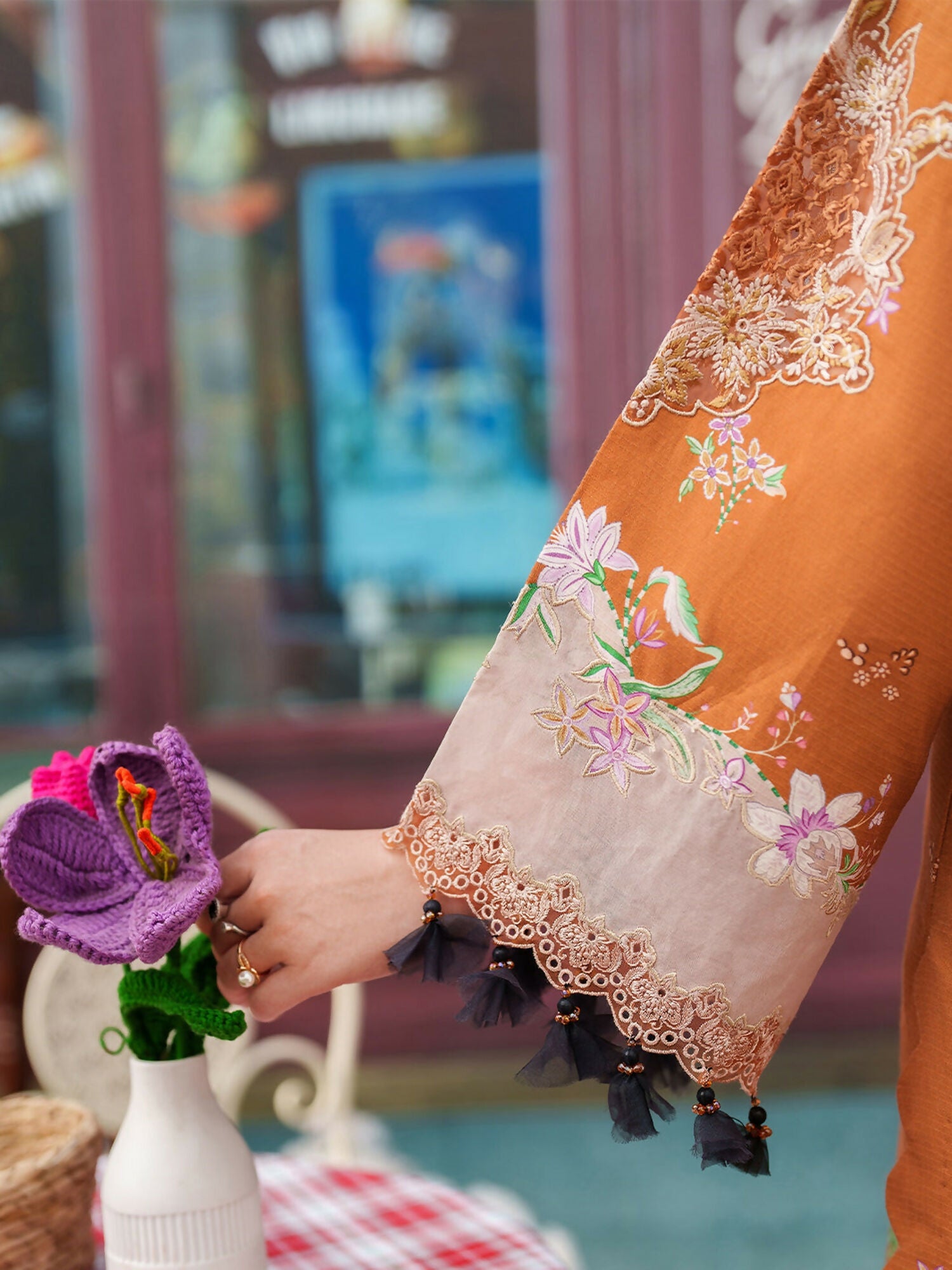 A stylish 3-piece viscose suit featuring a printed shirt with elegant embroidery, paired with a matching printed trouser and an embroidered chiffon dupatta for a refined and graceful look.