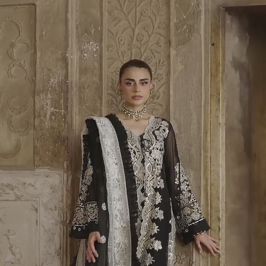 An exquisite 3-piece suit crafted on chiffon and raw silk, designed with intricate embroidery and elegant details. The shirt features embroidered chiffon left and right panels, kali side panels, a beautifully embroidered back, and sleeves. Additional embellishments include embroidered front patches, back lace, and sleeve lace, all perfectly complemented with a plain dyed silk inner for comfort and layering. The ensemble is finished with an embroidered chiffon dupatta for a graceful drape and a plain dyed raw silk trouser to balance the refined look.