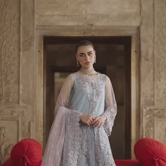 A luxurious 3-piece unstitched ensemble designed with timeless elegance. The net shirt is adorned with intricate embroidery, enhanced with front, sleeve, and trouser laces for a refined look. It is paired with a beautifully embroidered net dupatta, while the plain dyed raw silk trouser completes the outfit with sophistication. Perfect for formal and festive wear.