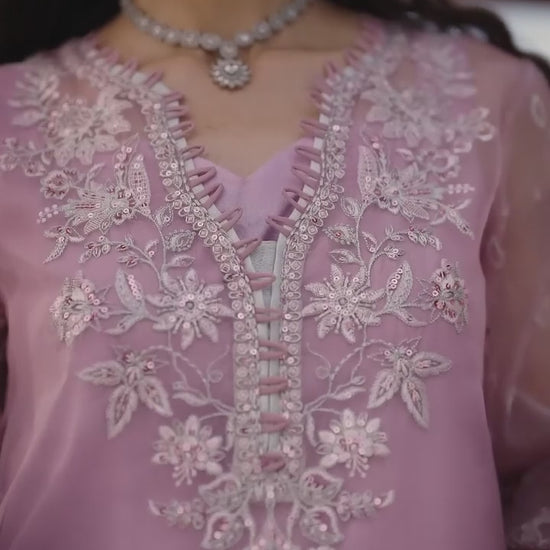 An exquisite 3-piece unstitched suit crafted with sheer elegance. The organza shirt features finely embroidered details, enhanced with daman and patch lace work for a graceful finish. The look is elevated with a beautifully embroidered organza dupatta, while the raw silk trouser adds a touch of sophistication. Perfect for festive and formal occasions.