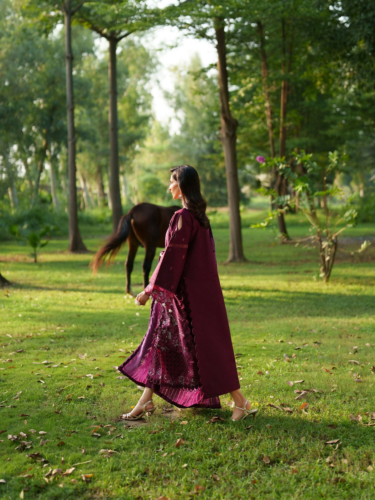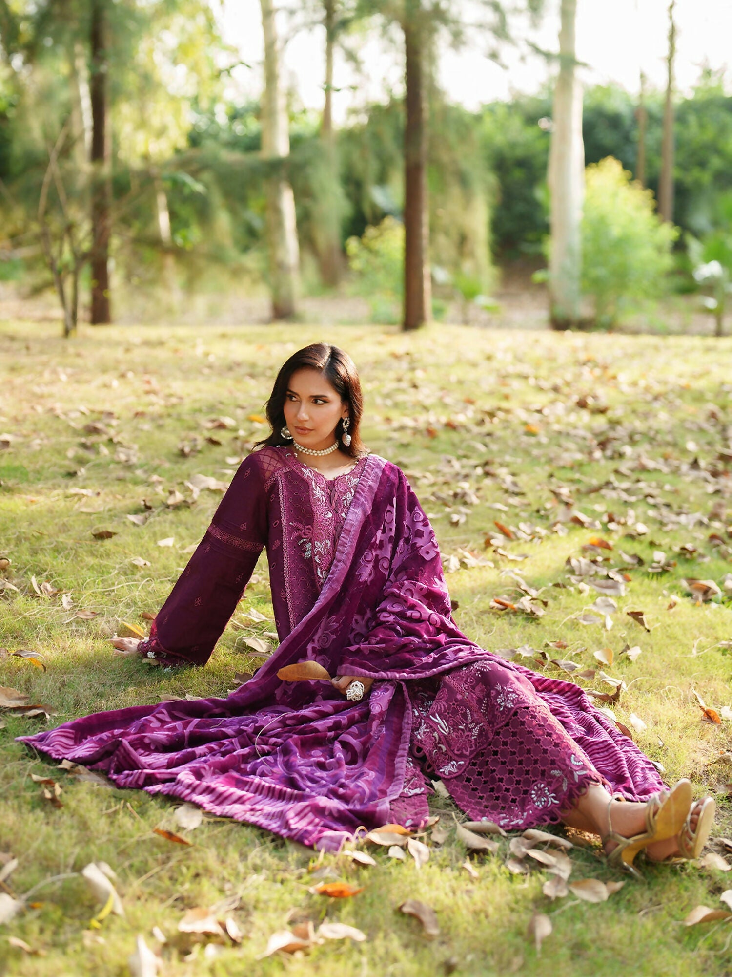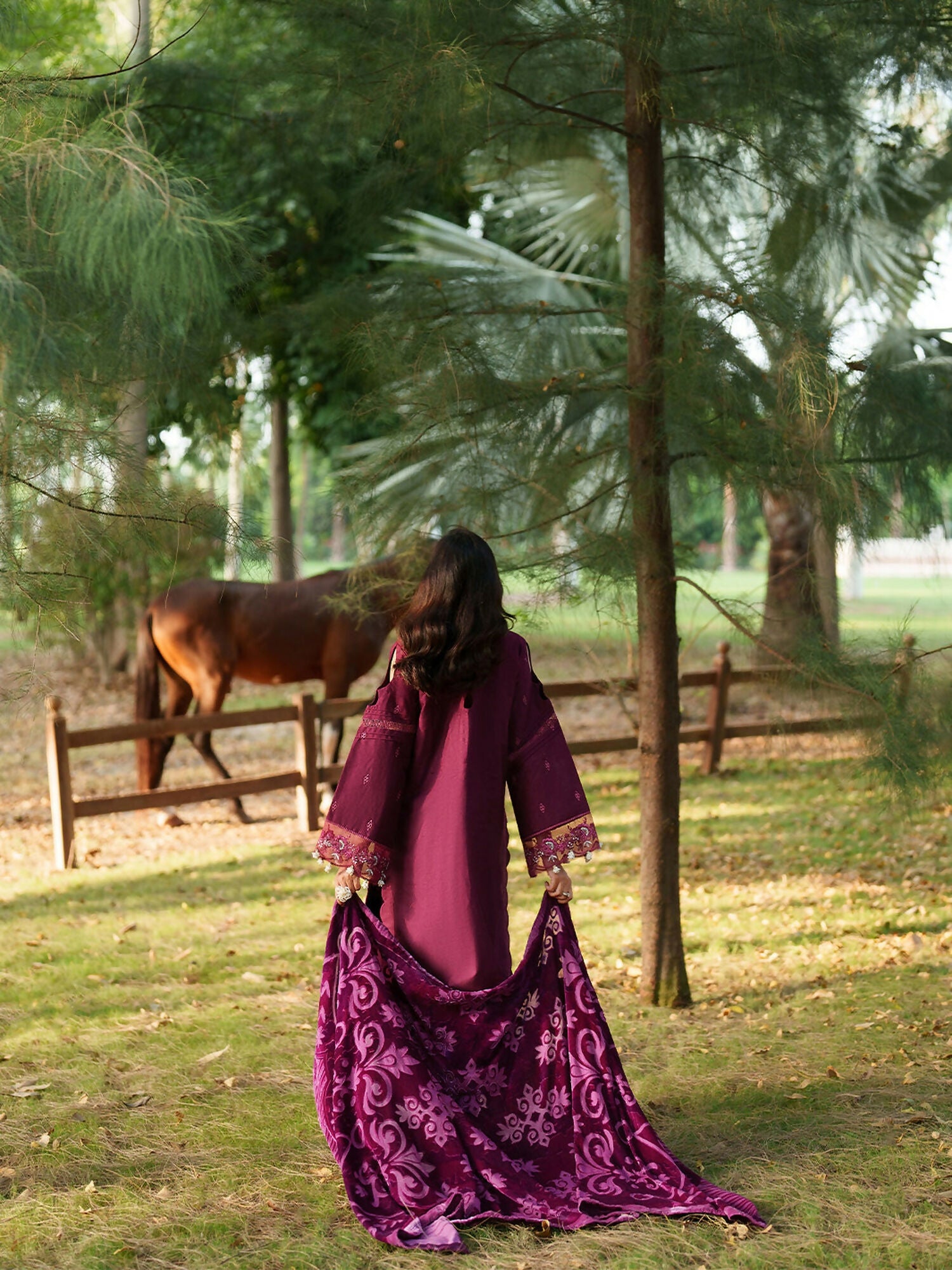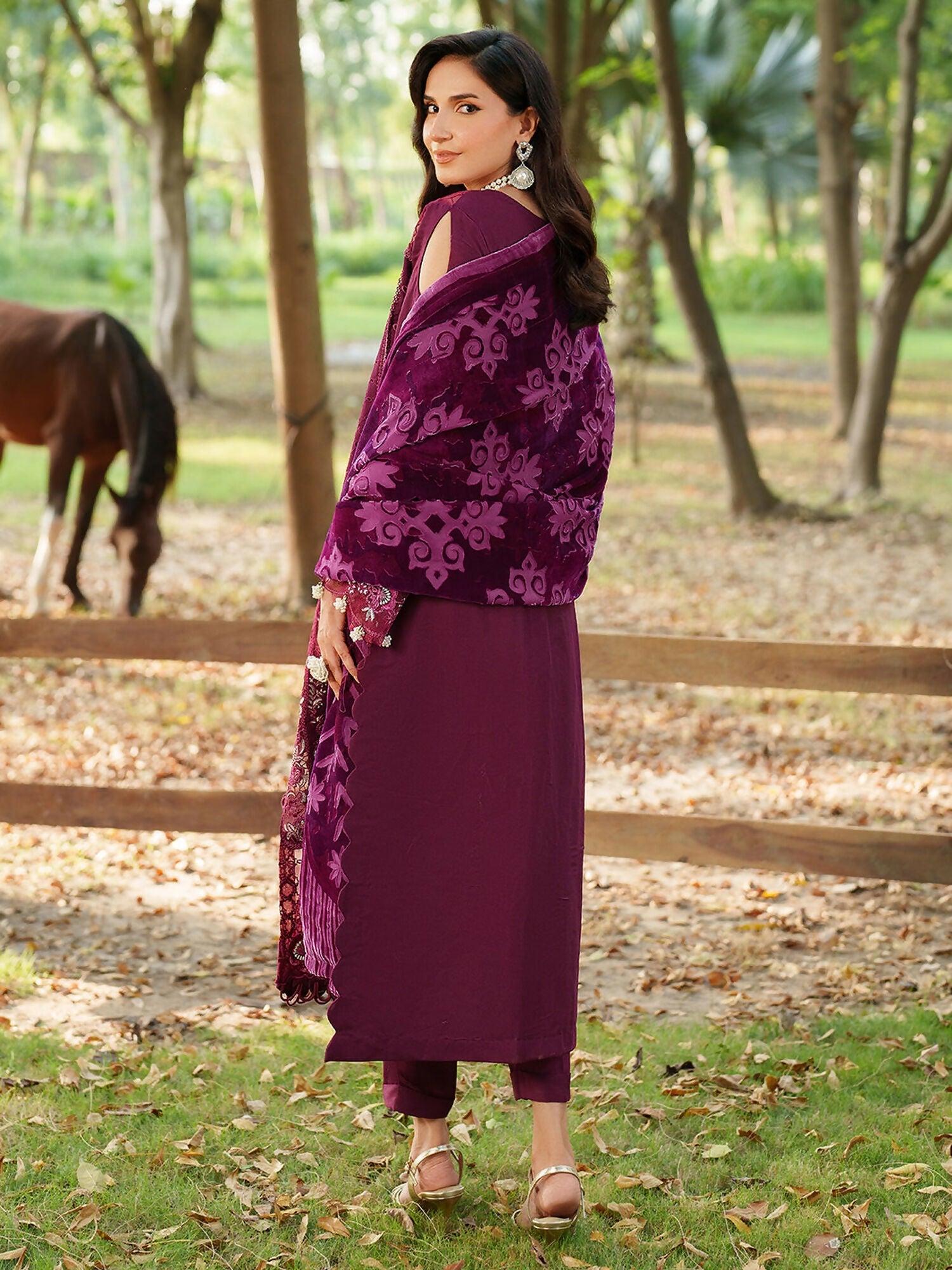 Embrace elegance with this unstitched 3-piece suit, featuring rich embroidered corduroy details paired with a luxurious palachi shawl and matching trouser perfect for timeless winter style.