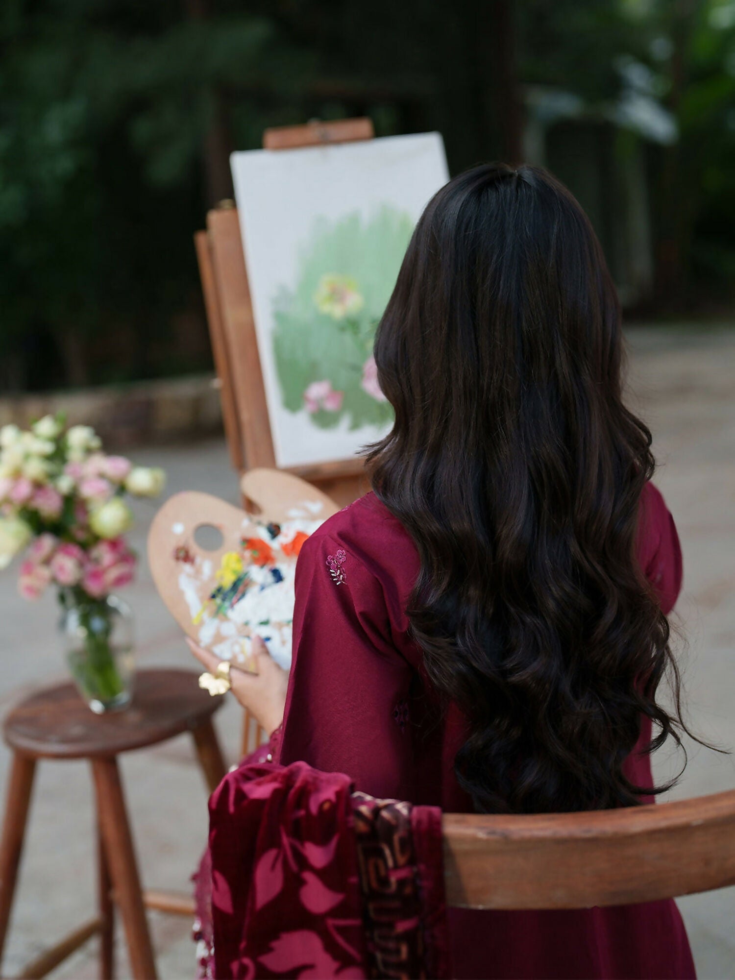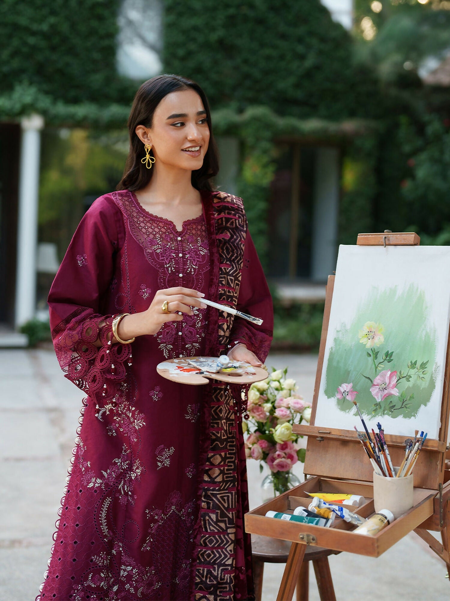Embrace elegance with this unstitched 3-piece suit, featuring rich embroidered corduroy details paired with a luxurious palachi shawl and matching trouser perfect for timeless winter style.