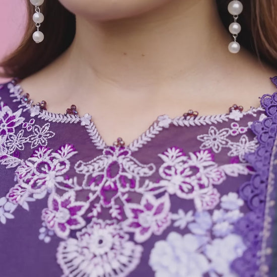 A cozy and stylish winter 3-piece suit featuring a printed khaddar shirt adorned with refined embroidered details, paired with a warm printed poly wool shawl and a dyed khaddar trouser for a complete seasonal look.