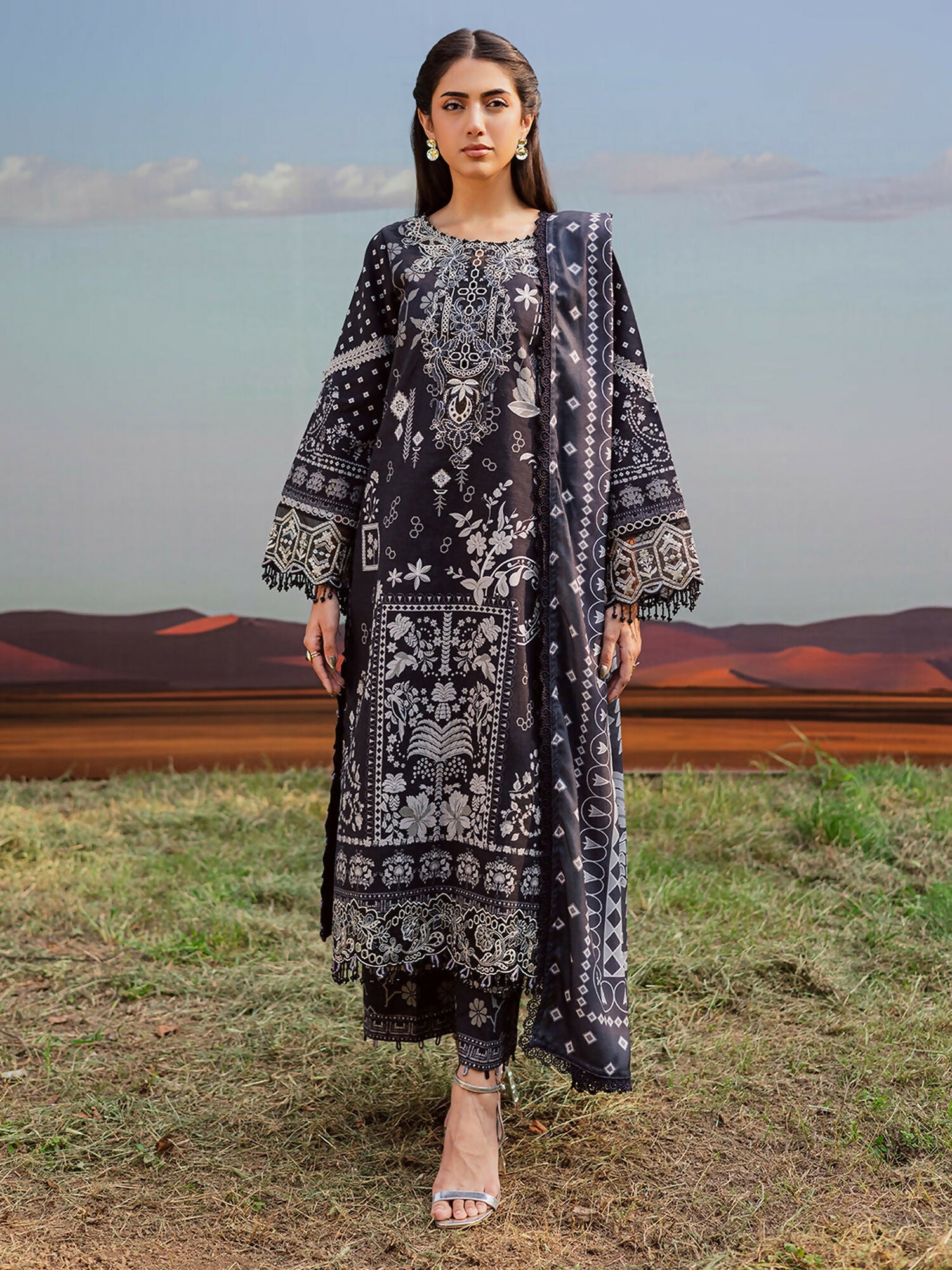 A cozy and stylish winter 3-piece suit featuring a printed khaddar shirt adorned with refined embroidered details, paired with a warm printed poly wool shawl and a dyed khaddar trouser for a complete seasonal look.