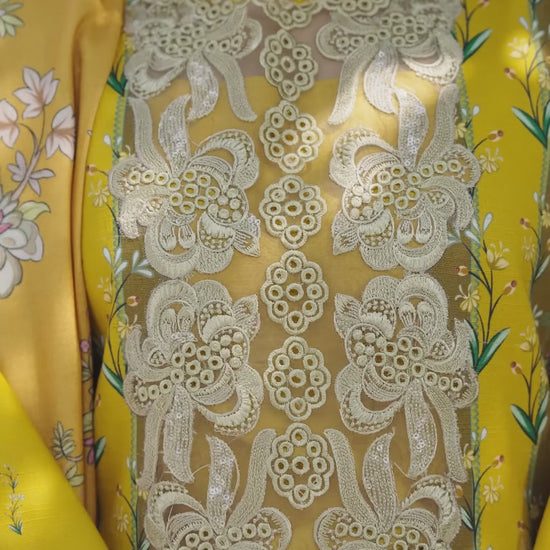 A cozy and stylish winter 3-piece suit featuring a printed khaddar shirt adorned with refined embroidered details, paired with a warm printed poly wool shawl and a dyed khaddar trouser for a complete seasonal look.