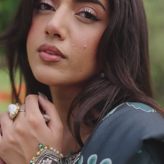 From Parishay’s Rang-e-Sarma collection, this unstitched 3-piece suit is a perfect balance of style and comfort. The printed khaddar shirt is detailed with an embroidered neckline, front border, and sleeve borders, complemented by a printed poly wool shawl and printed khaddar trouser for a complete winter ensemble.