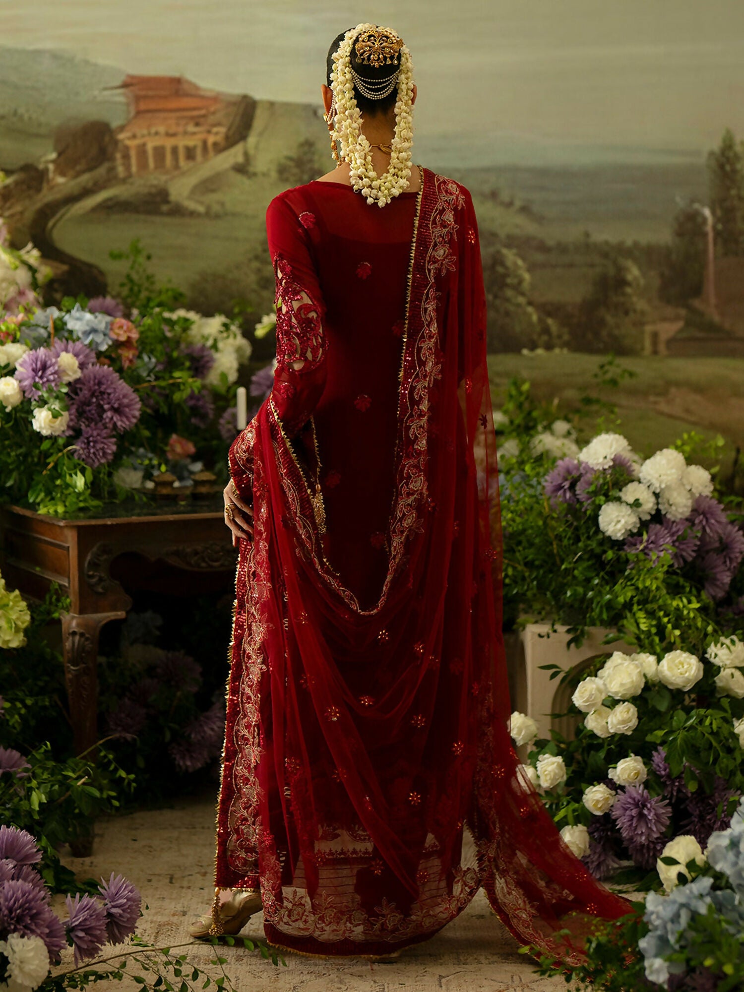 A luxurious stitched ensemble in embroidered chiffon and organza, paired with a soft raw silk trouser and lining for a timeless formal look.