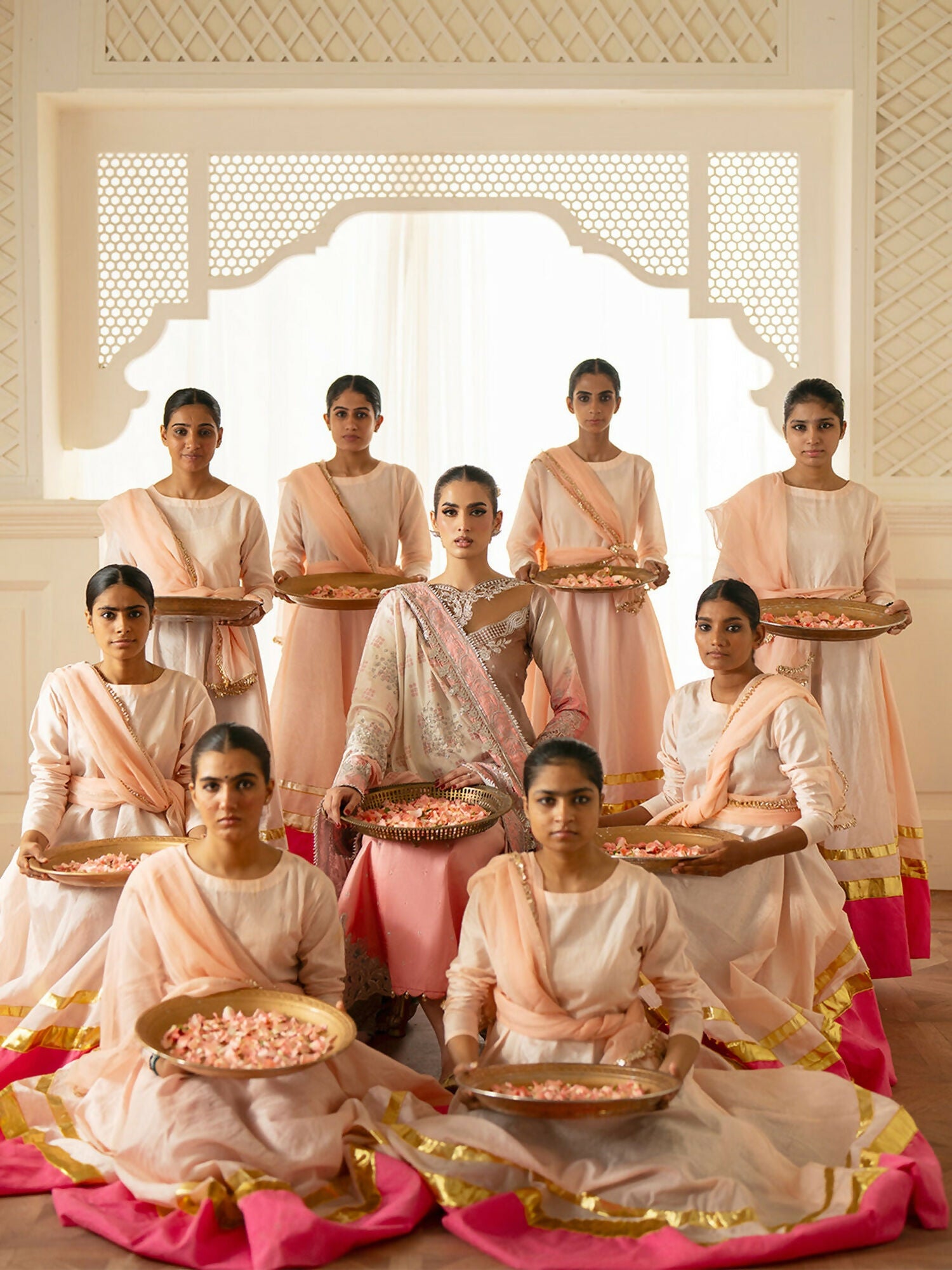 A luxurious stitched ensemble crafted in embroidered printed silk and organza, paired with a soft raw silk trouser. This outfit combines delicate embellishments with elegant fabrics for a sophisticated and timeless formal look.