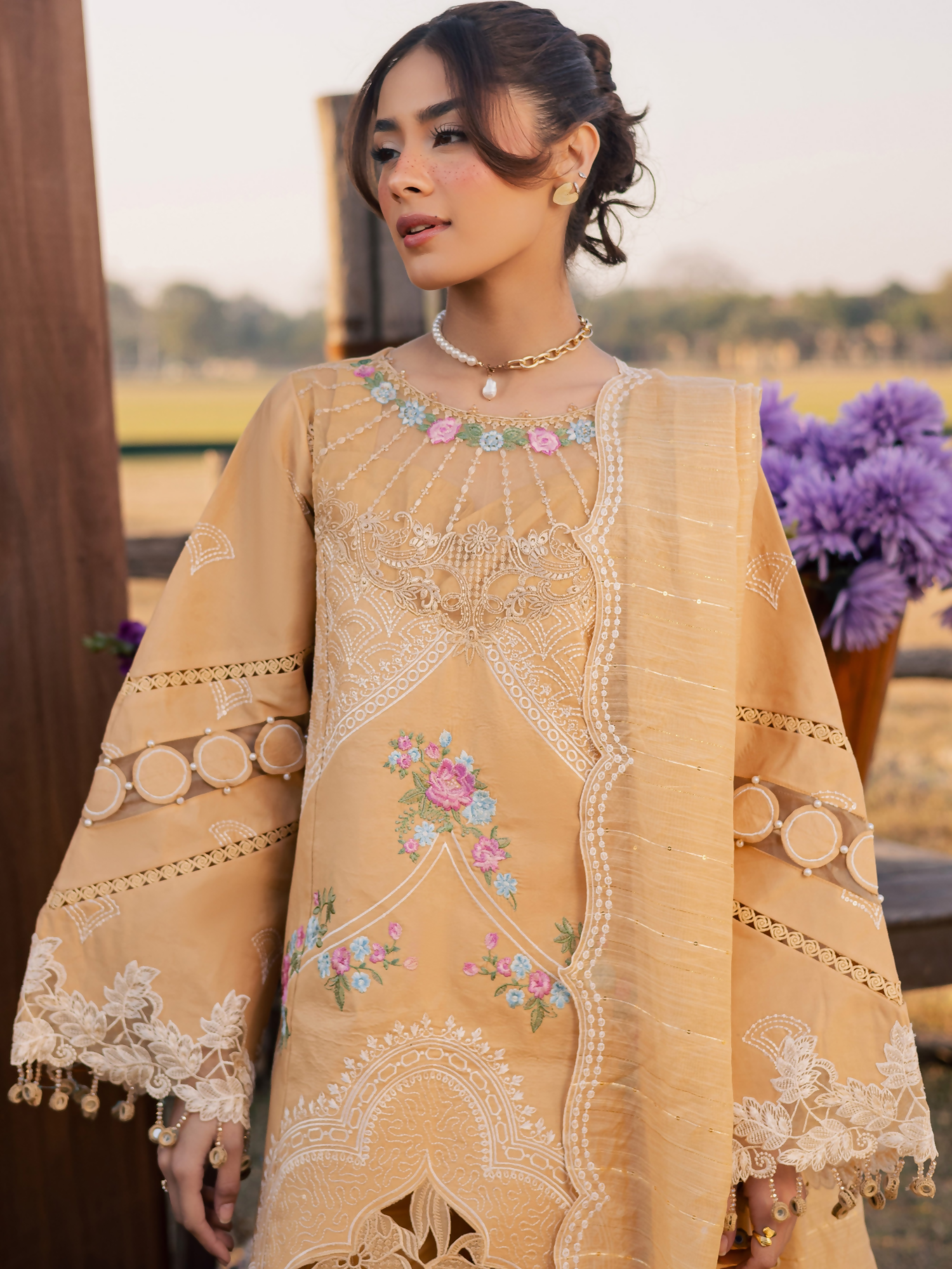 Step into elegant charm with this beautifully crafted 3-piece ensemble made on a premium lawn base, featuring delicate embroidery and intricate detailing. Paired with an embroidered sequence Munaar dupatta and classic cambric trouser, this outfit is perfect for festive and semi-formal occasions.