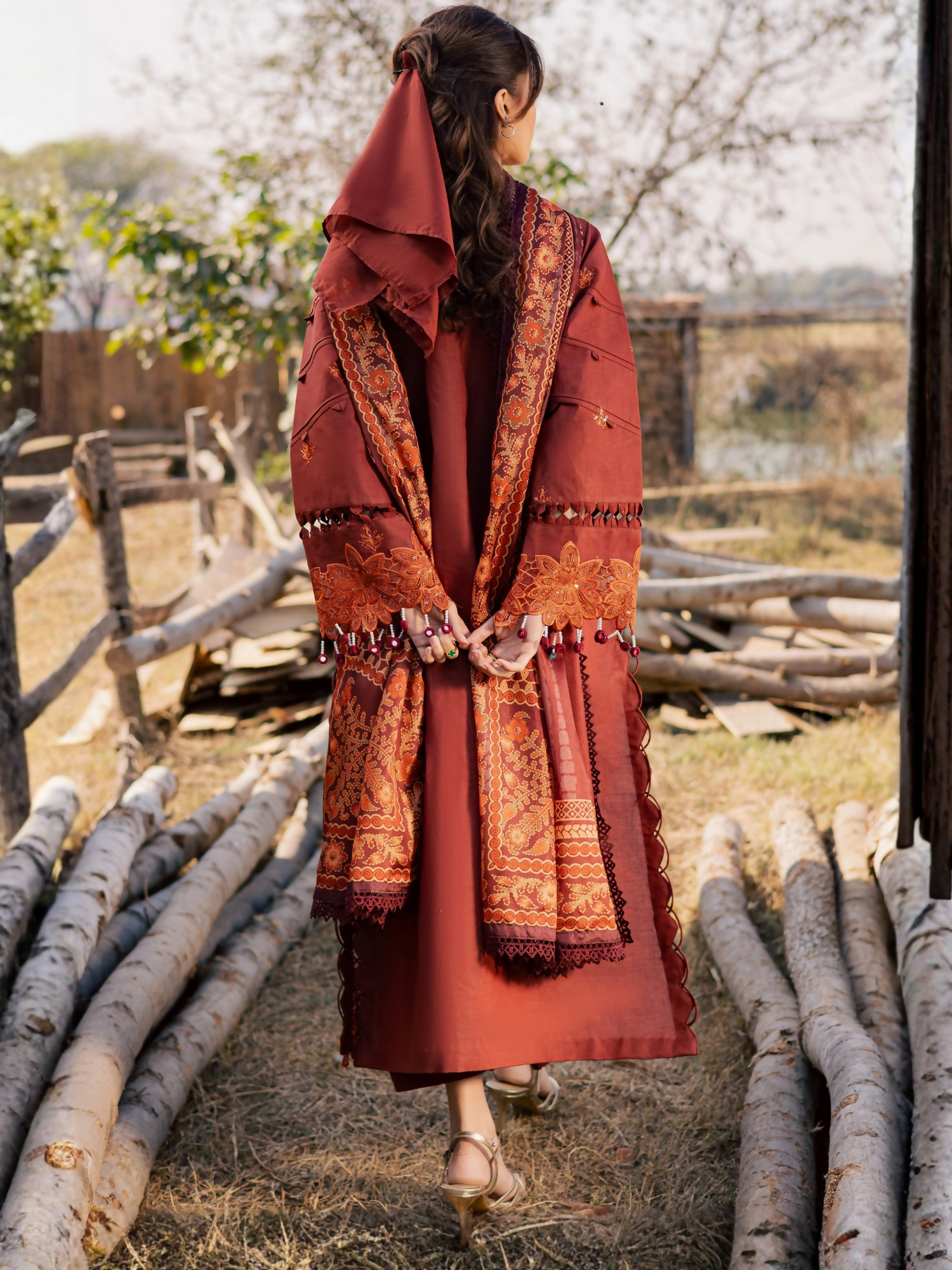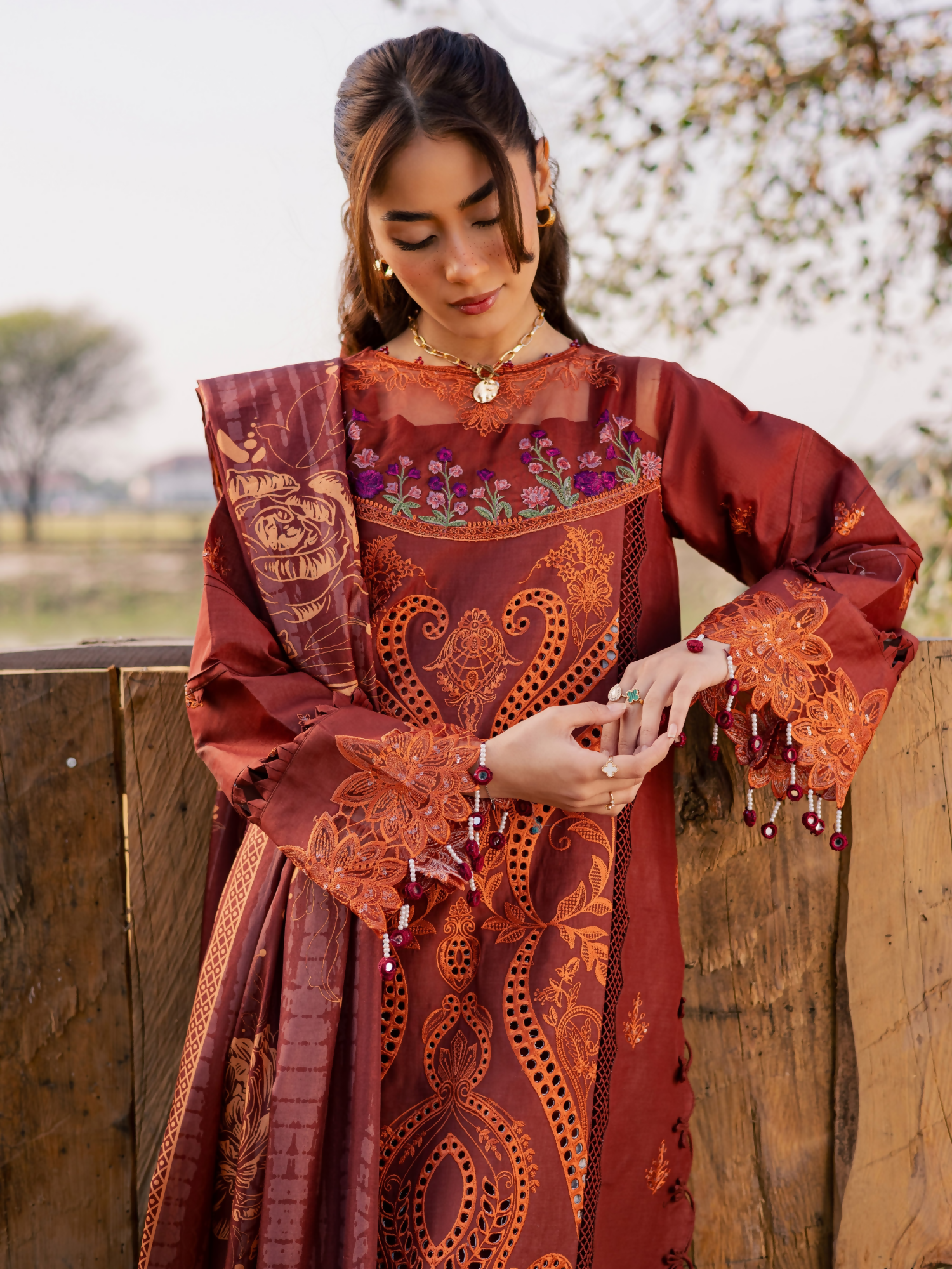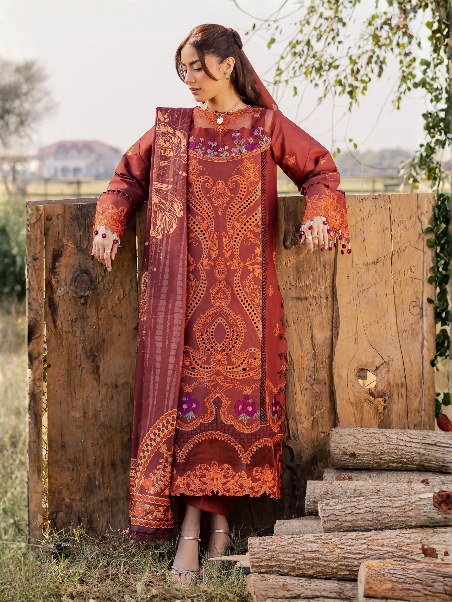 Step into graceful sophistication with this exquisitely crafted 3-piece ensemble made on a premium lawn base, featuring delicate embroidery and refined detailing. Paired with a printed Calcutta silk dupatta and classic cambric trouser, this outfit is perfect for festive and semi-formal occasions.