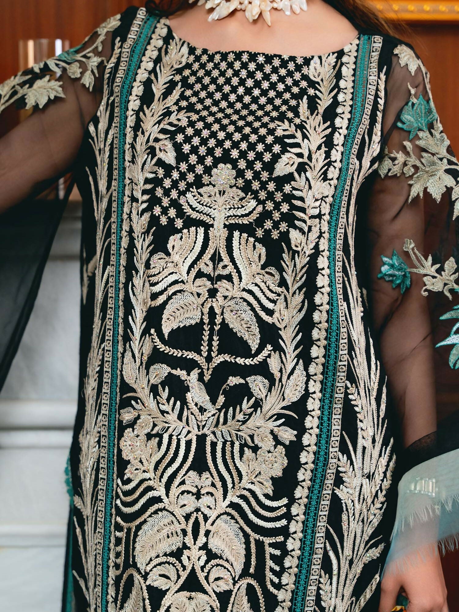 This exquisitely designed black ensemble masterfully created by Shiza hassan features rich floral adornment that is precisely designed, along with an elegantly embroidered and intricately detailed neckline. The sleeves are adorned with embroidery and organza detailing in true SH Couture Fashion masterfully paired with alluring viscose pants and a silk digital print dupatta with block printed palo to create a perfect look.