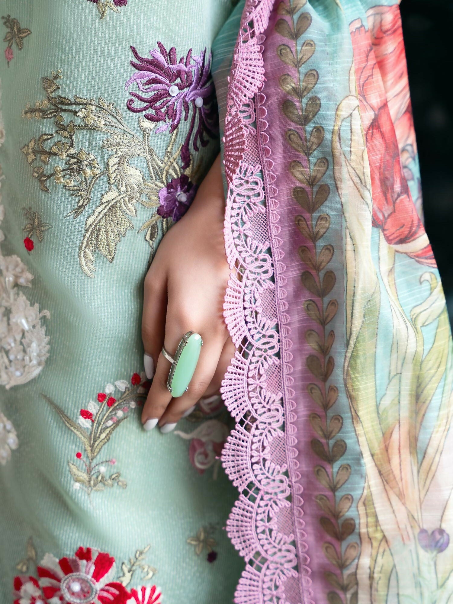 Azure Is A Long Shirt Silhoutte With Colorful Embroidery Motifs All Over , Pearls And Stones Are Embellished Around The Neckline , Organza Embroiderd Border And Laces Are Used Across The Shirt Hem. Paired With A Cotton Net Digital Printed Dupatta Having Organza Patching On Hem And Straight Pants With Organza Cutwork Border To Completes This SH Look.