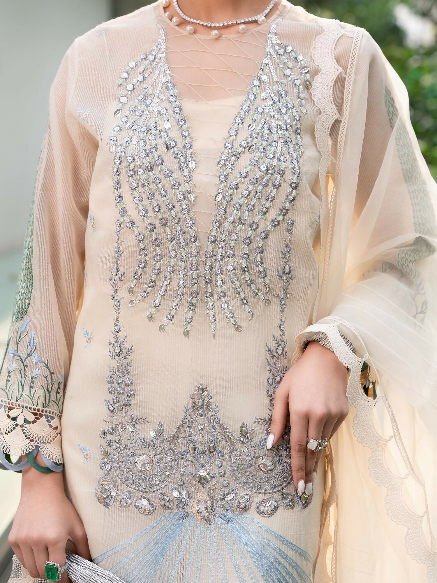 Adorned with delicately embellished NECKLINE and floral motifs, ‘CYRA is a classically designed ensemble in a divine shade of cream white. It’s finished off with intricate stitching details on hem along a silk patch .paired with an organza blue and cream doubel color dupatta adorened with laces and stitching details .viscose pents are added to complete this look.
