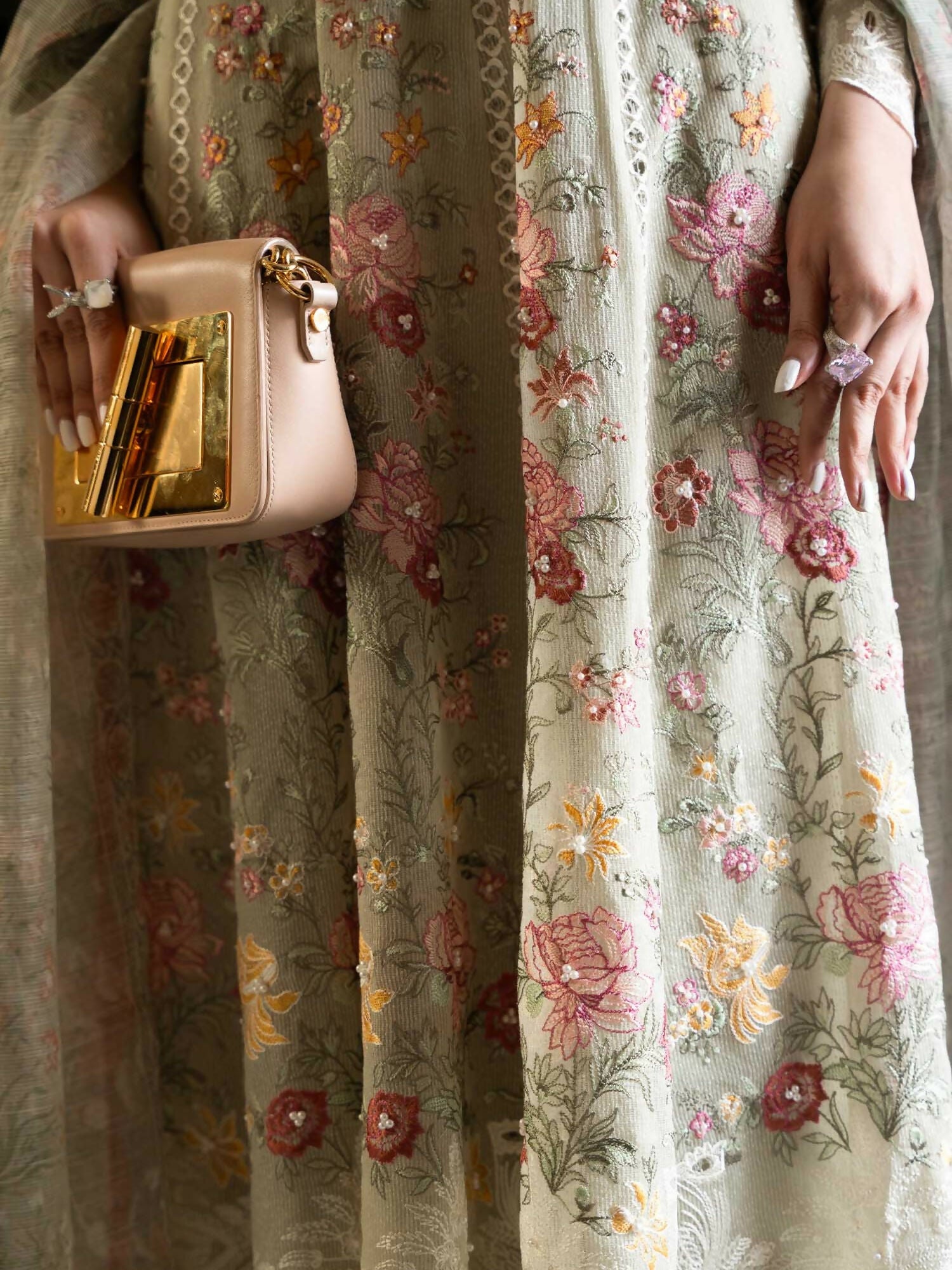 MIHA is a kalidar pishwas having side slits ,crafted with riched cotton net ,adorned with colorfull embroidery around neckline and panels .adding details with cutwork on the hem to make it a flawless running design , paired with a cotton net digital printed dupatta and viscose tappered pants.