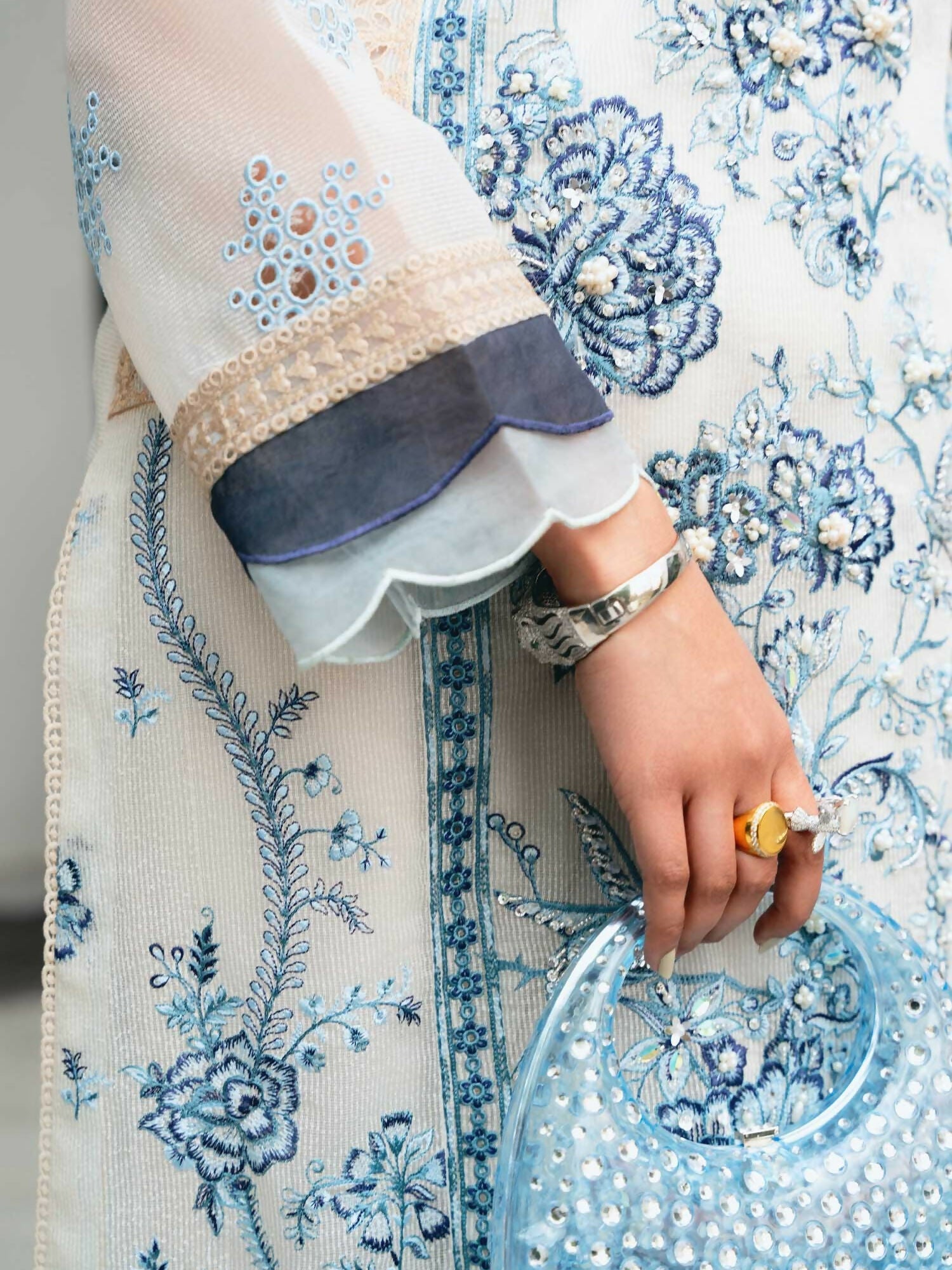 Reclassify elegance with our emerging creation ‘Dandelion Breeze’ adorned with a gorgeous neckline enhanced with an exquisite royal NS motif. The dress is complimented by a pleated embroidered hem as a sensual addition to its beauty. Along with a gorgeous organza dupatta and tapered silk pants to complement this gorgeous NS look!