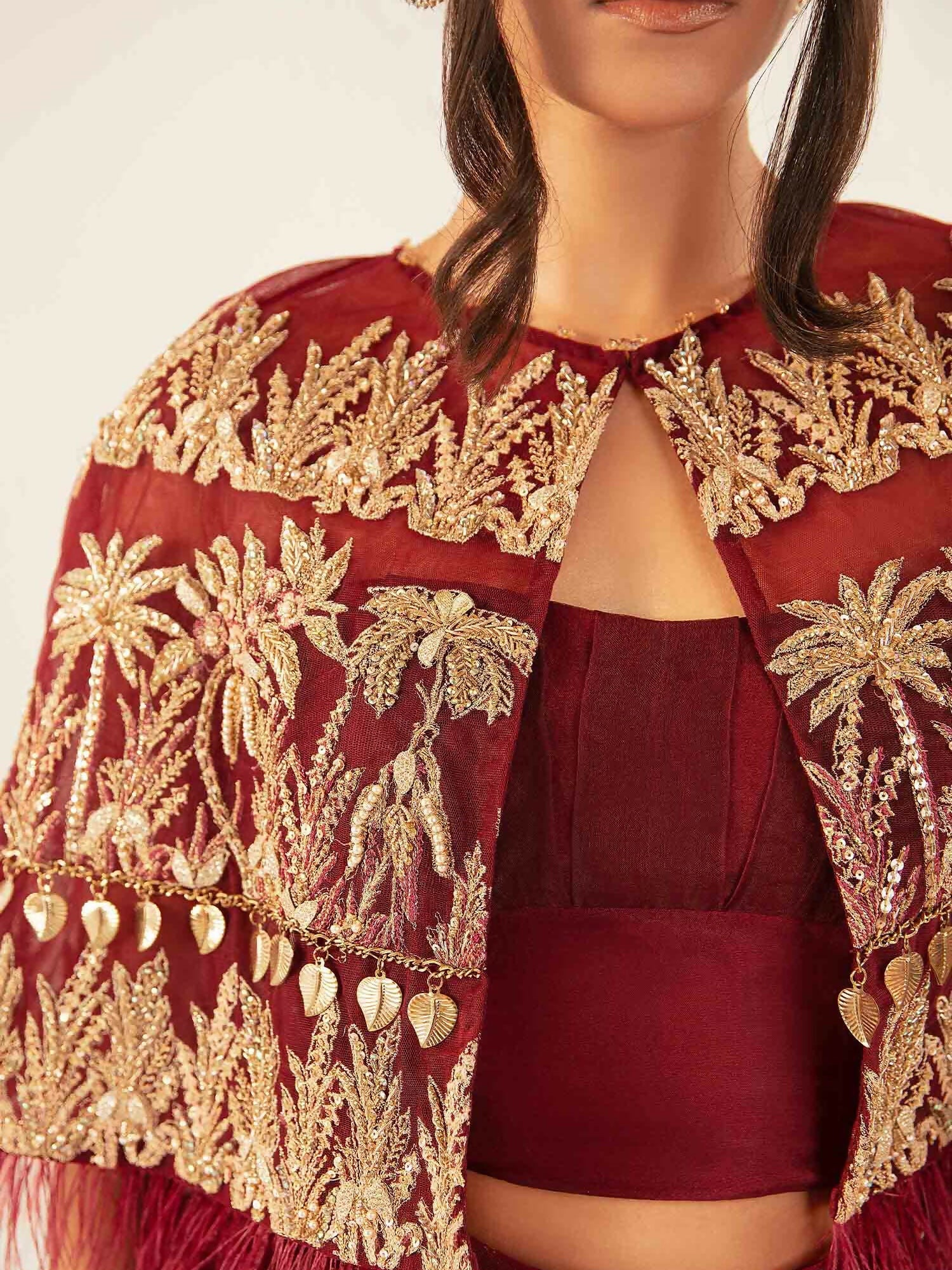 This opulent net cape, open at the front, is gracefully adorned with ornamental detailing, enhancing the elegance of the ensemble. It is paired with a raw silk blouse and a net saree featuring intricate work with pearls, resham, nakshi, and dabka, completed with a ruffled pallu showcasing stunning cut-work details — a truly regal and sophisticated look.