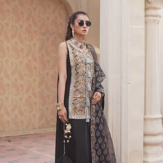 A relaxed silhouette, tailored from sumptuous pure tusser silk, in the colour of all seasons, black with pops of ice blue and gold are added to make a lasting impact. An array of signature SH details, consisting embroidery and hand worked neckline add a subtle sparkle to your look. Delicate and intricate silk threadwork in coordinating hues along the from neckline, makes this an inevitable show stopper The gorgeous pure organza dupatta with gorgeous color blocking and an aubergine border with glimmering gold block print adds a graceful flair to your outfit.