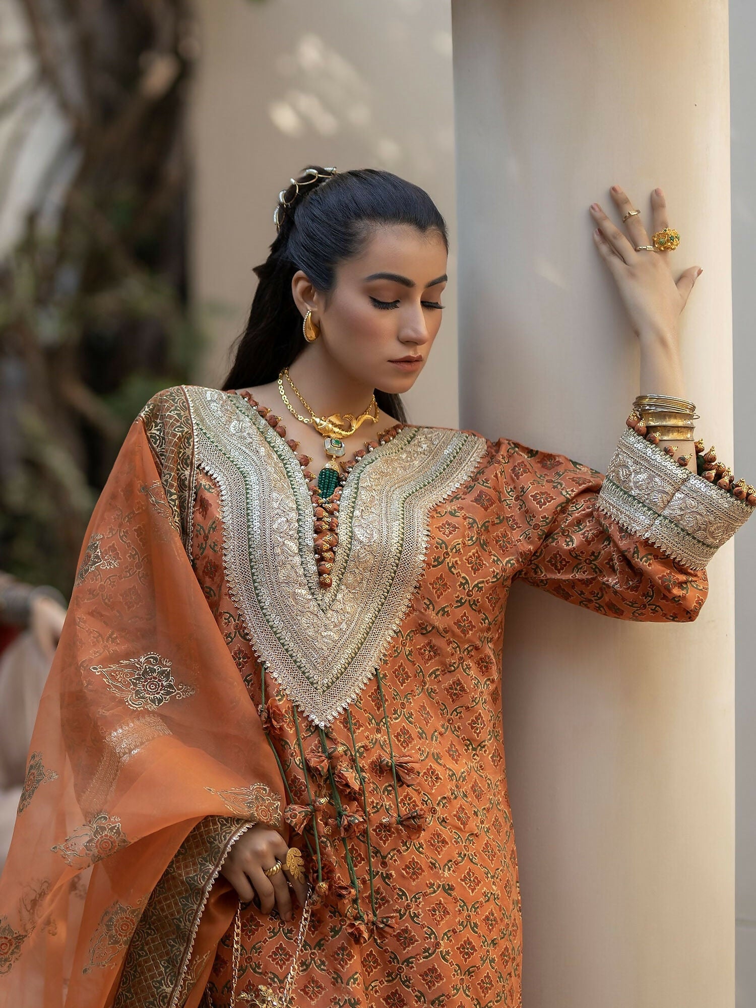 Presenting a must have collection, filled with distinctive, quintessentially SH block prints. All masterfully tailored to be worn and loved for years to come. Our feminine and floaty ensembles are your easiest solution to looking most perfectly put together.This ensemble has a canvas of vibrant rust and hot olive green, artfully illustrated with a myriad of hues and pristine details. Adorned with delicate embroideries on the neckline and sleeves this floor length silhoutte is a sure shot show stopper. The pure organza dupatta is a coordinating tangerine with block printed borders , to create a lasting impact.