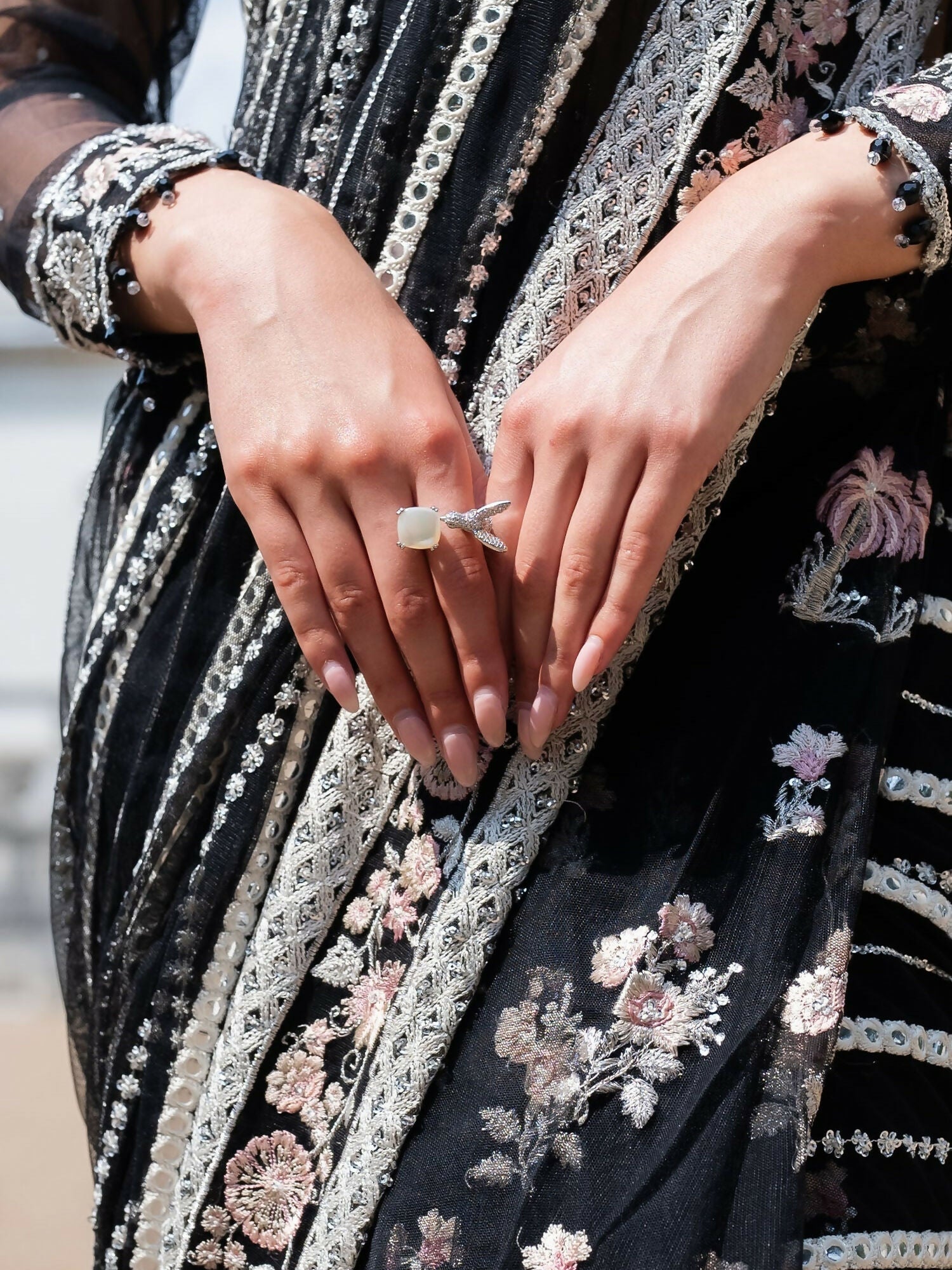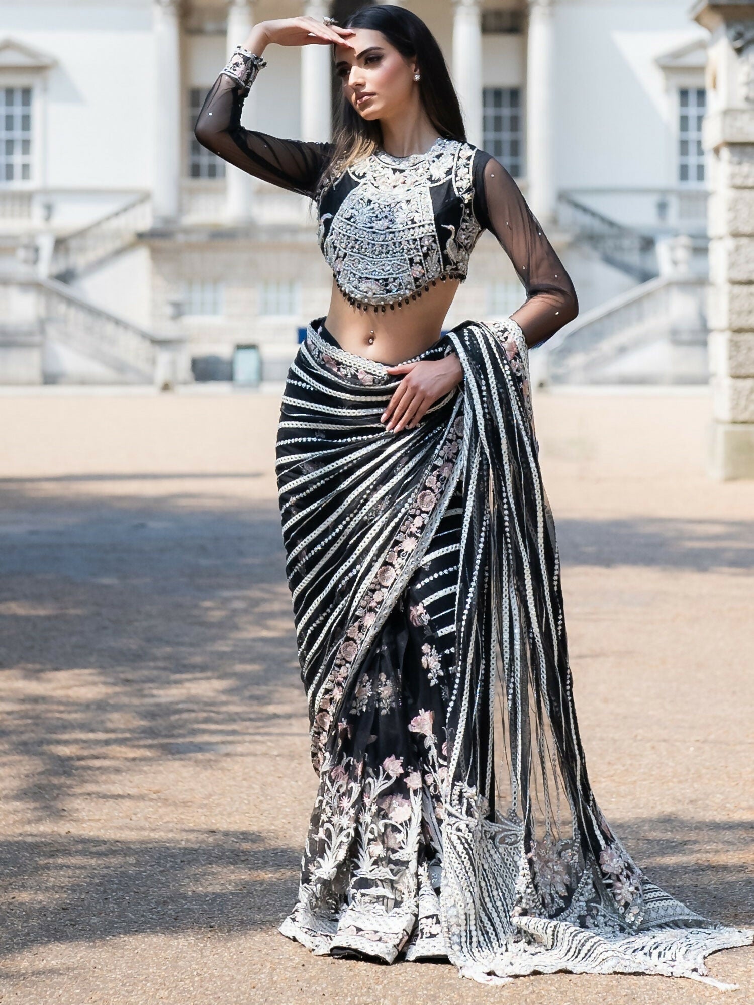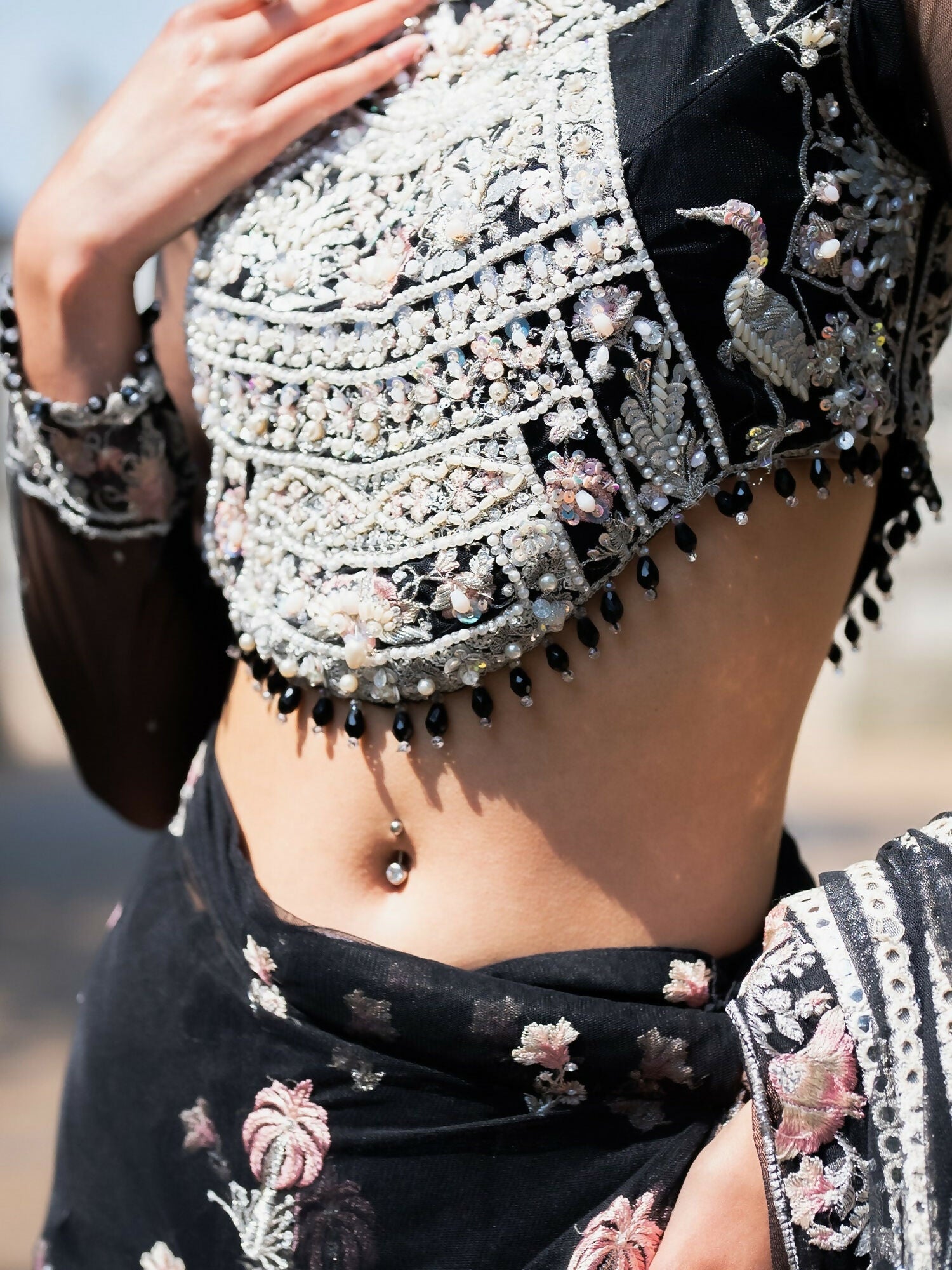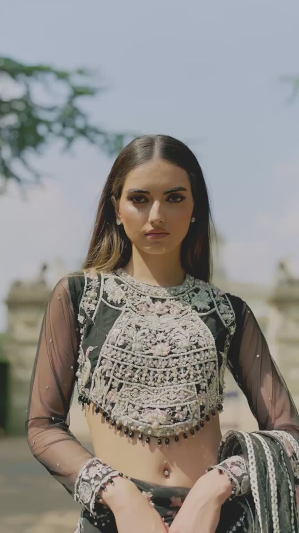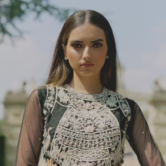 This truly exquisite Saree is a sure head turner this festive season. A rhapsody of black , intricately embellished with delicate classic SH embroidery just aposed with gleaming pearls sequence and panni work, enriched with exquisite crystals. Enhanced with alluring intricate embroideries and hand embellishments.