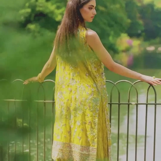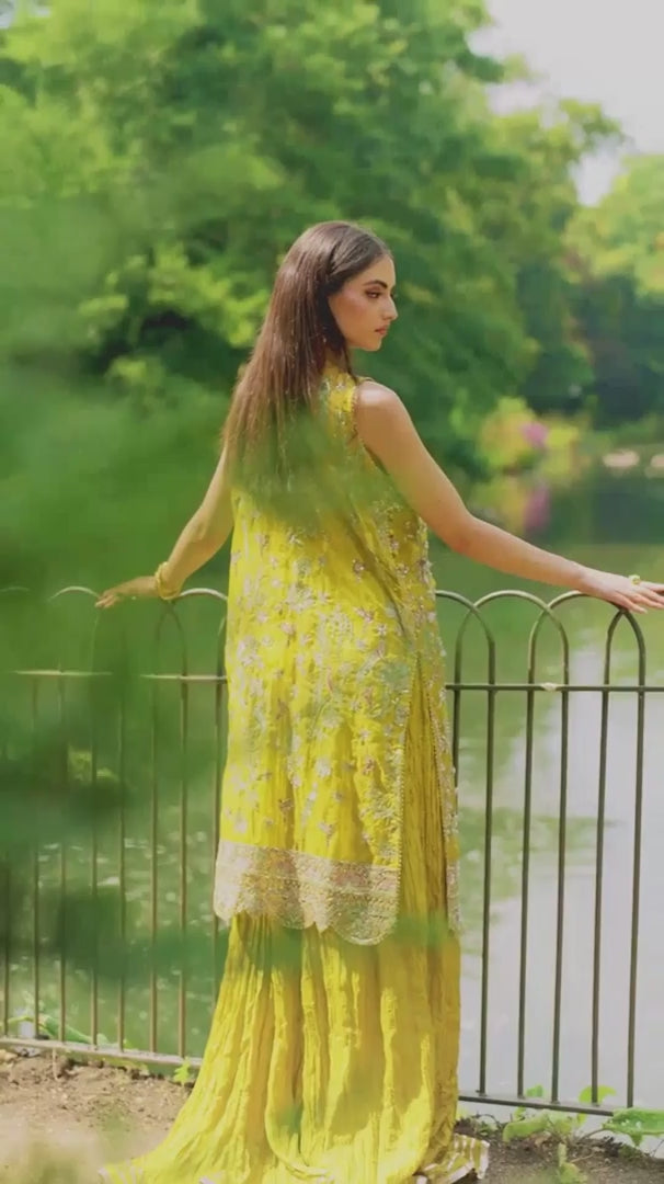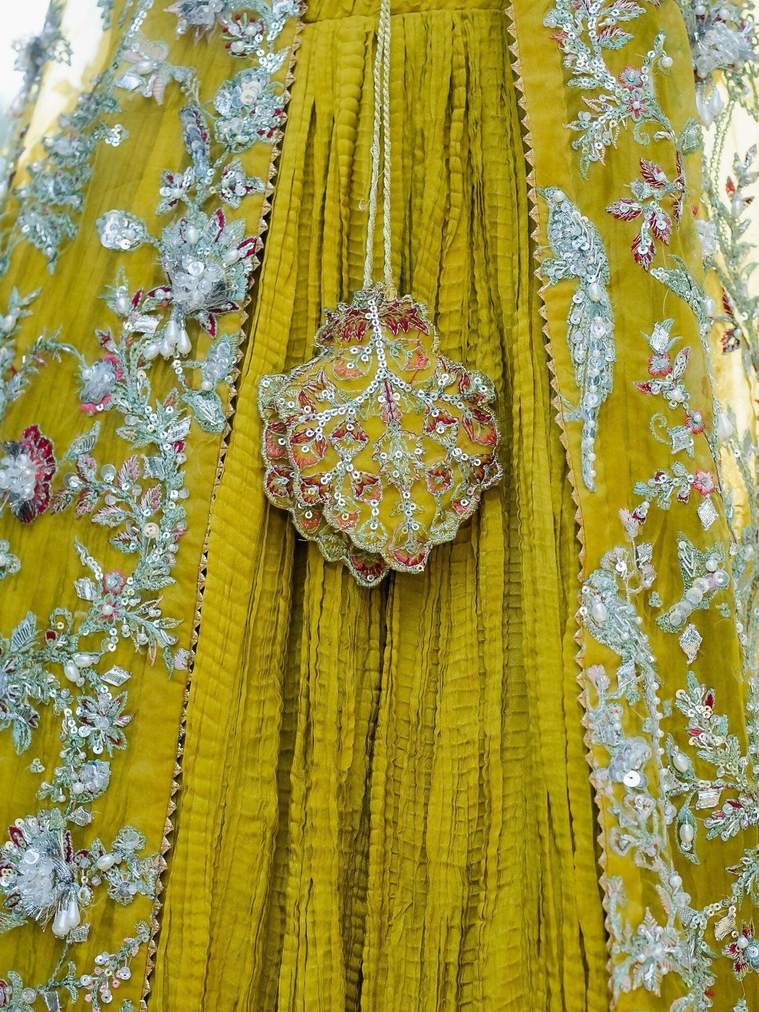 “Floraison,” a lime green shirt meticulously crafted from premium organza delicately embroidered cotton net fabric and adorned with exquisite Artisan Adda work. The shirt features floral motifs that gracefully dance across the front, meeting a scalloped hemline with intricate embroidery ana handwork . Paired with pearl silk crushed pishwas that boast elegant lappa along the hemline, a net embroidered dupatta is added to complete this look.