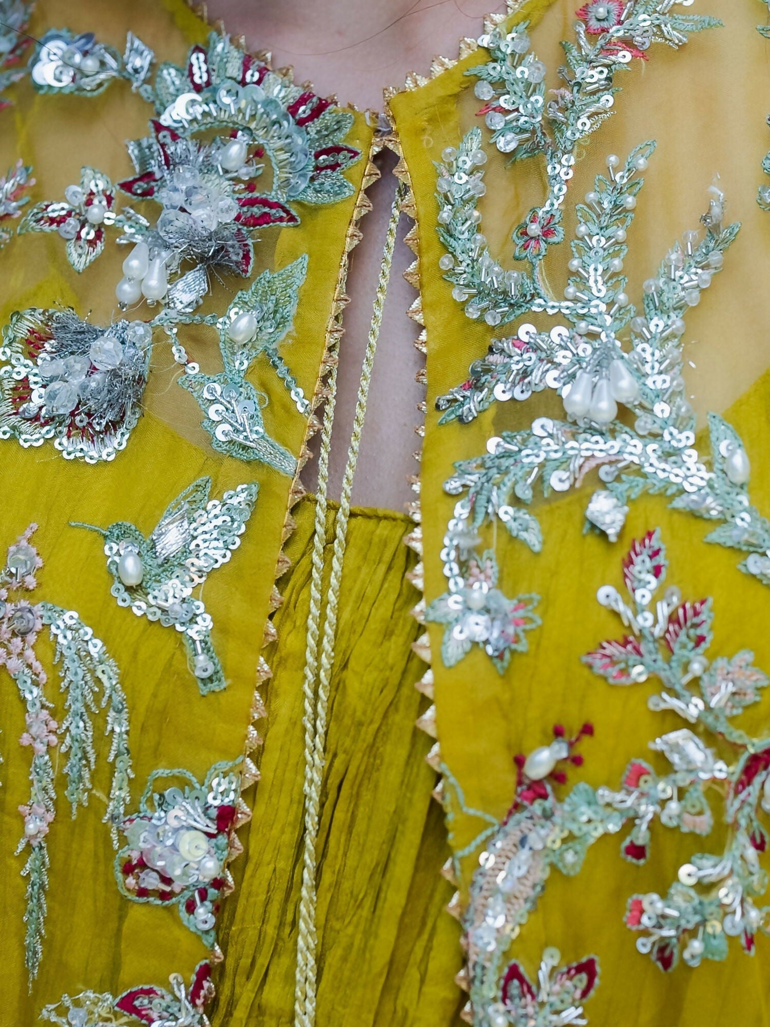 “Floraison,” a lime green shirt meticulously crafted from premium organza delicately embro...