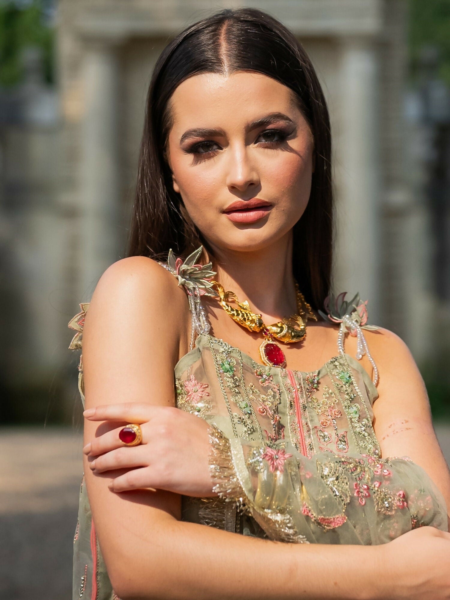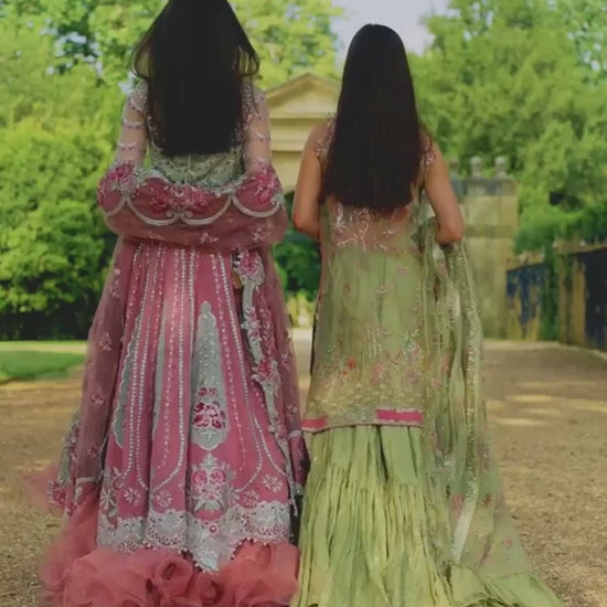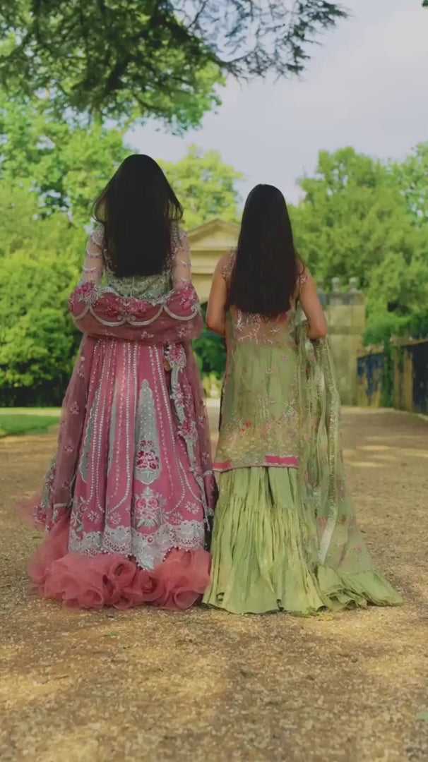 Introducing “SAHAR,” a refined ensemble that redefines elegance.shirt is crafted in organza , in a lighter shade of mint, is adorned with exquisite gold and silver handwork , presenting a masterpiece of artistry tailored for the modern generation with a penchant for tradition. The ethereal net dupatta features intricate embroidery motifs and ruffels on the palo, adding an enchanting touch to the ensemble. Complementing this is a printed sharara enhanced with delicate gota embroidered borders, completing the look with a fusion of sophistication and heritage.