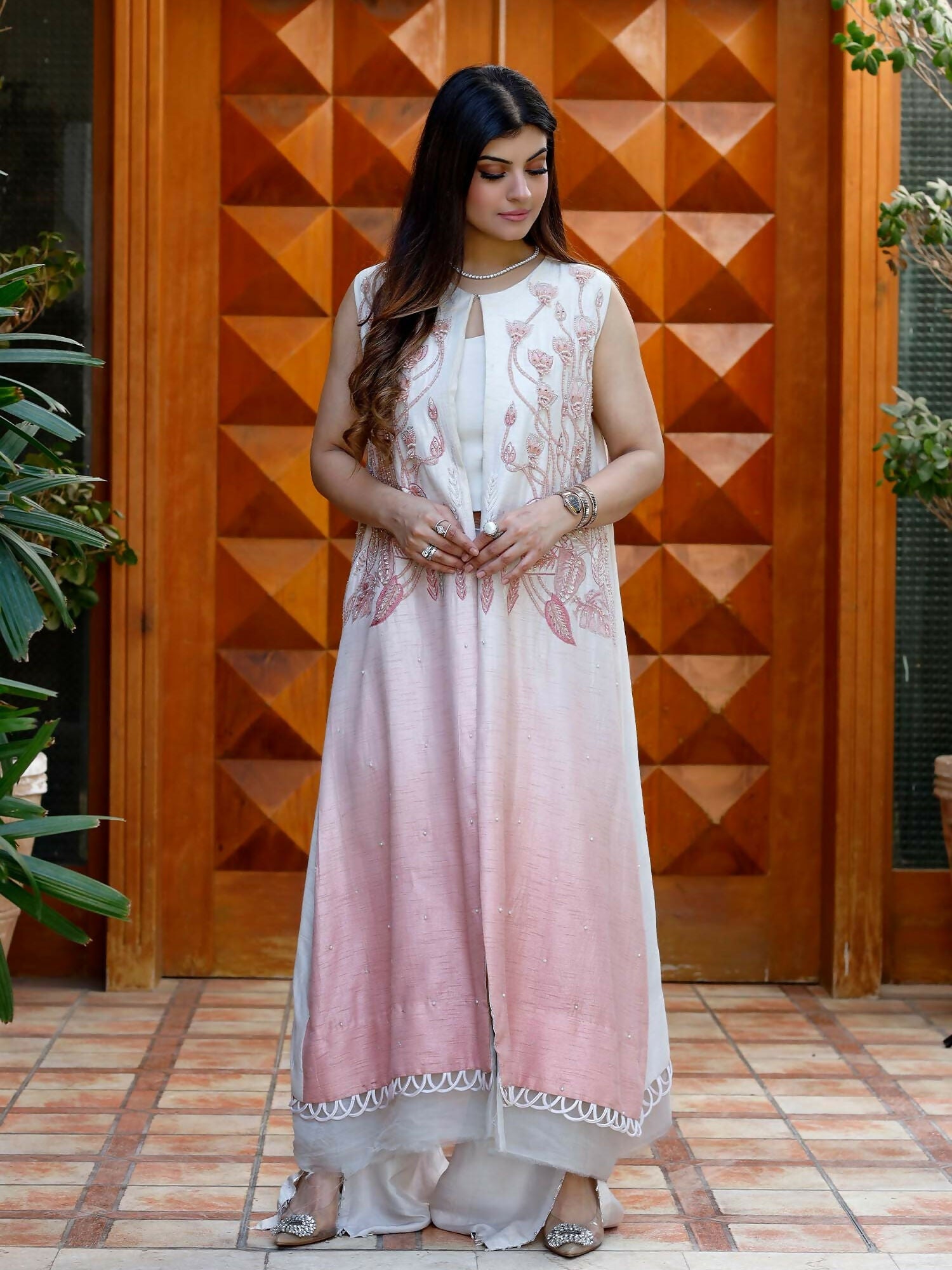 Verve jacket is detailed with embroideries, adorned with crystals and pearls. Styled with delicate organza finishing and stitching details. Bootcut pants and a halter neck top is attached to complete this look.