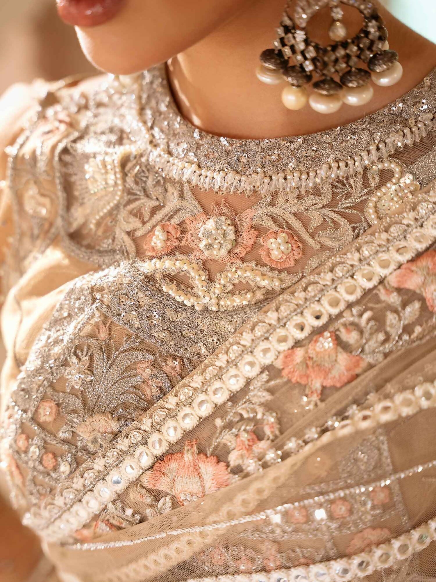 This truly exquisite Saree is a sure head turner this festive season. A rhapsody of ivory , intricately embellished with delicate classic SH embroidery just aposed with gleaming pearls sequence and panni work, enriched with exquisite crystals. Enhanced with alluring intricate embroideries and hand embellishments.